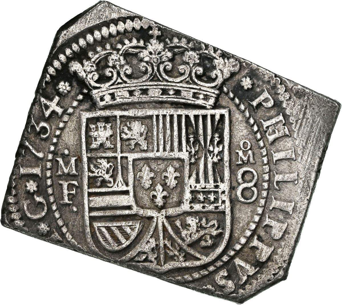 MEXICO, Mexico City, klippe 8 reales, 1734/3 MF, rare, NGC AU details / saltwater damage (Shipwreck Blue Label). Yonaka-M8T-34a; S-M28; KM-48; Cal-1432. 26.14 grams. An exceptional example with practically full details and perfectly angular-cut edges, the cuts oriented so that the full king's name and date are on the flan, virtually no corrosion, nicely contrasting toning, clear 4/3 overdate. Recovered from: Rooswijk, sunk in 1739 southeast of England