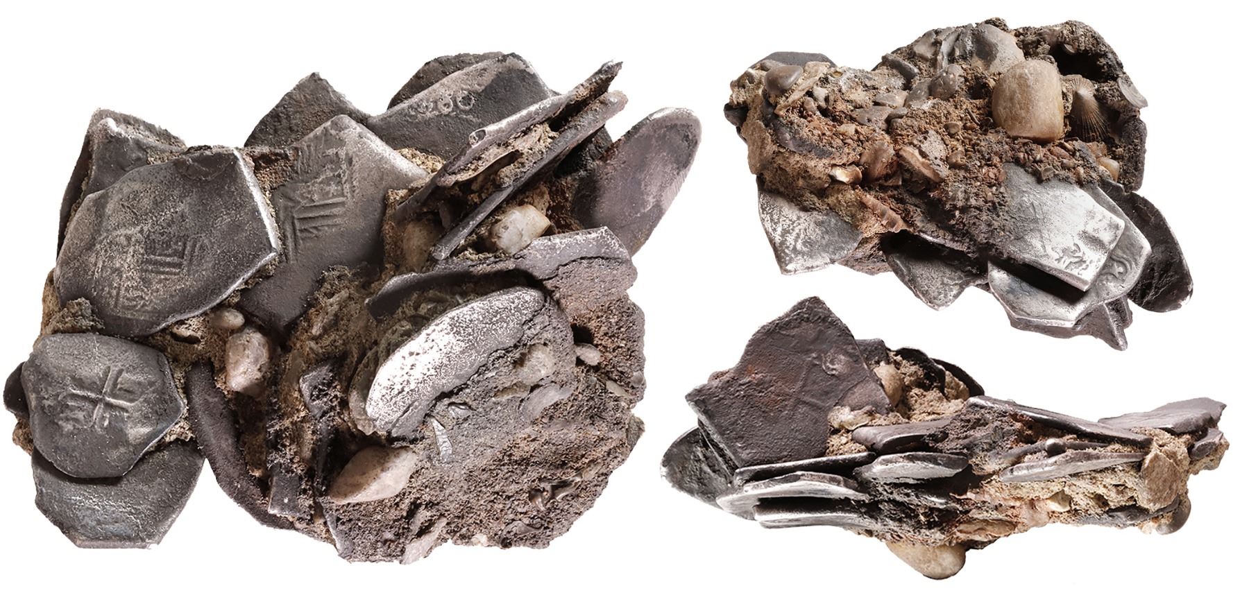 MEXICO, Mexico City, large clump of at least twenty cob 8R and 4R, Philip IV or Charles II, assayers not visible, one with clear date 1680. 636 grams total. roughly 5" x 3¼" x 2". The most impressive shipwreck cob clump we have offered in some time, with most of the coins exposed (albeit worn as usual from this wreck), one even with full 680 of date prominent, also all nicely toned, solidly held together with tan-green-orange encrustation including small rocks and shells (one full limpet, for example), rather heavy in hand and obviously the perfect showpiece paperweight for a shipwreck-collecting executive, sure to attract abundant interest. Pedigreed to the Steve Valentine Collection, with original certificate from the salvor/conservator. Recovered from: Joanna, sunk in 1682 off South Africa