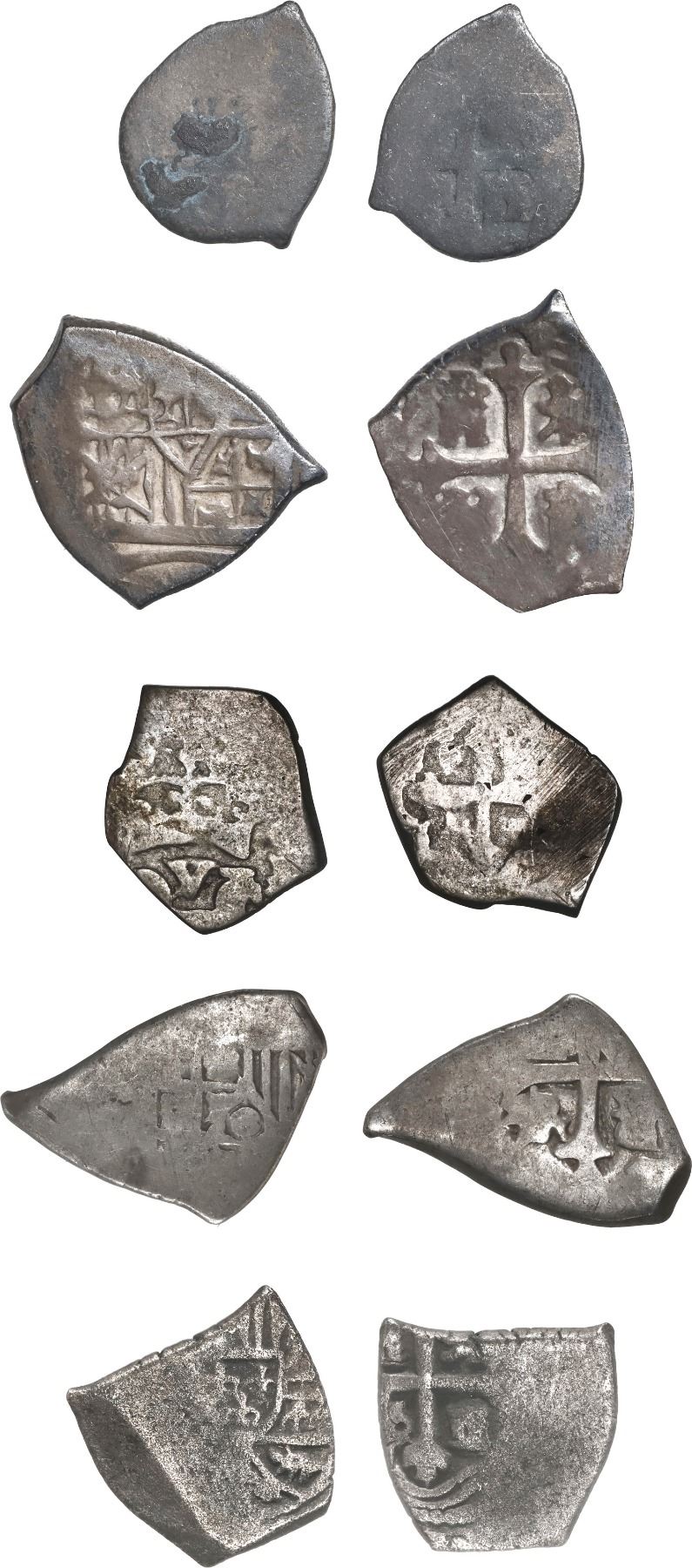 MEXICO, Mexico City, lot of five small cobs (three 1R and two ½R), Charles II and Philip V, assayers not visible. 13.00 grams total. All solid with little to no saltwater corrosion, most with nice shield or monogram and cross details, a few darkly toned. Recovered from: Spanish 1715 Fleet, sunk off the east coast of Florida