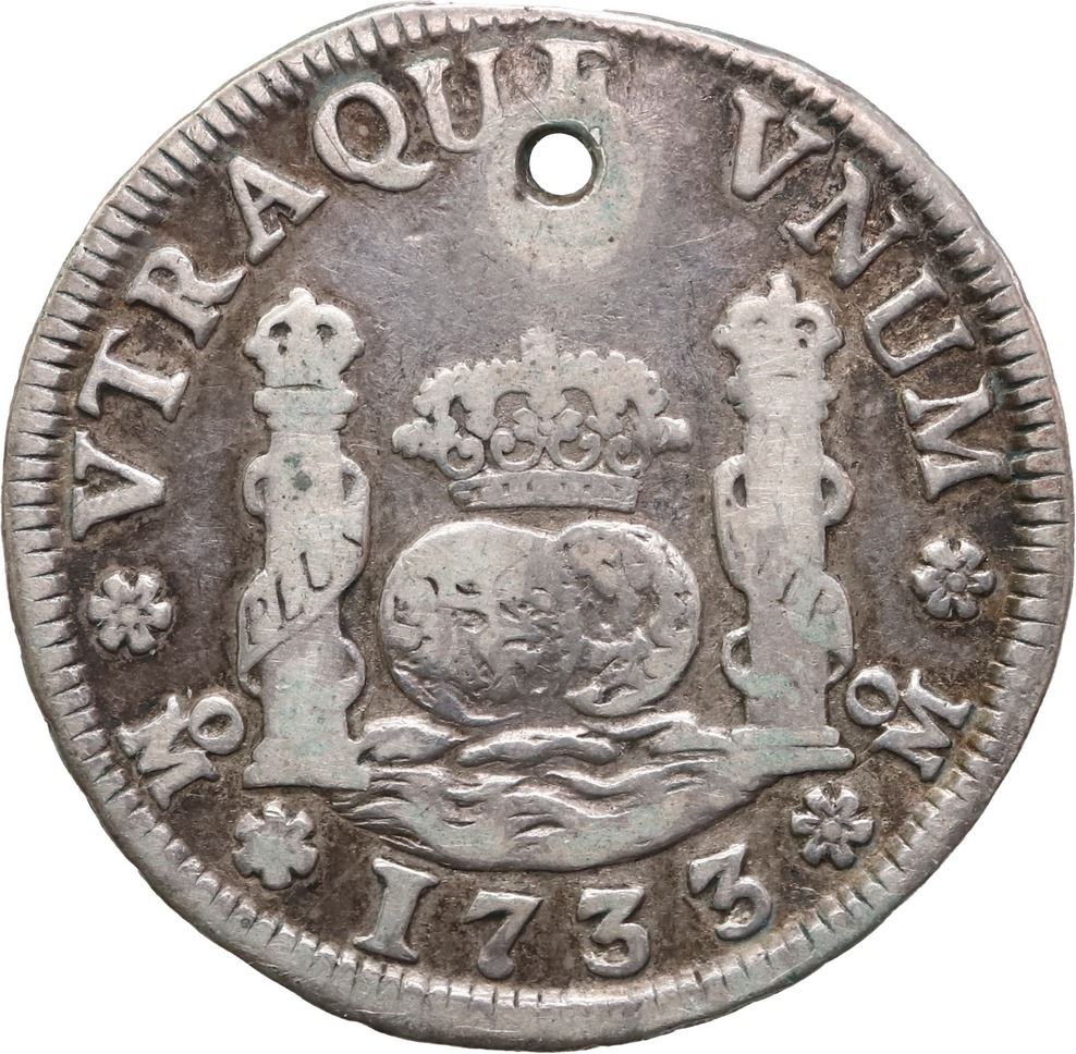 MEXICO, Mexico City, pillar 2 reales, Philip V, 1733 MF, pellets above and below assayer. KM-84; Cal-806; Yonaka-M2.33c. 6.31 grams. Scarce variety of the desirable second date of issue, an attractively toned VF with old hole and minor edge-clip at top. Pedigreed to the Ponterio auction of February 1997, with original lot-tag 456.
