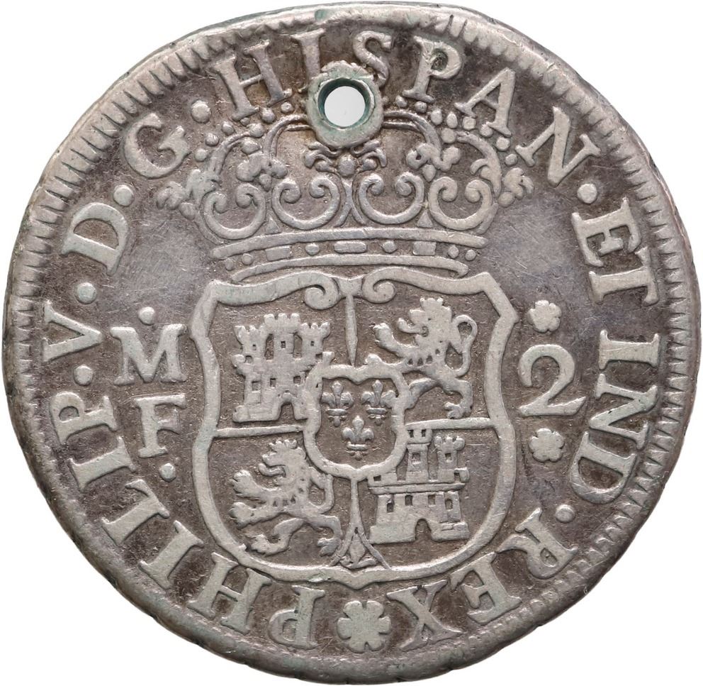 MEXICO, Mexico City, pillar 2 reales, Philip V, 1733 MF, pellets above and below assayer.