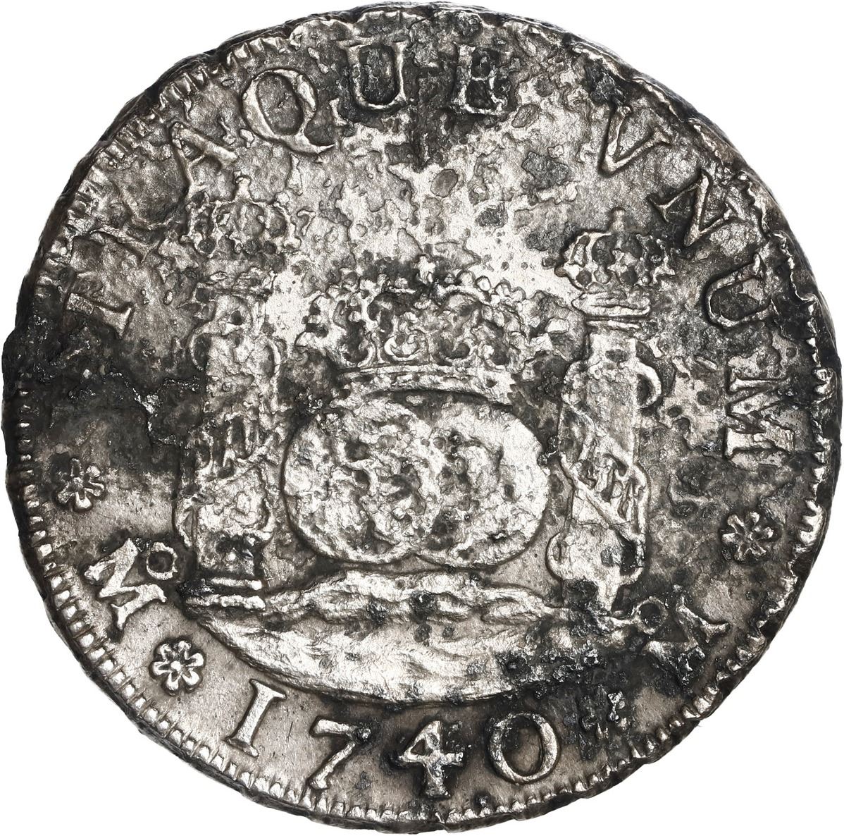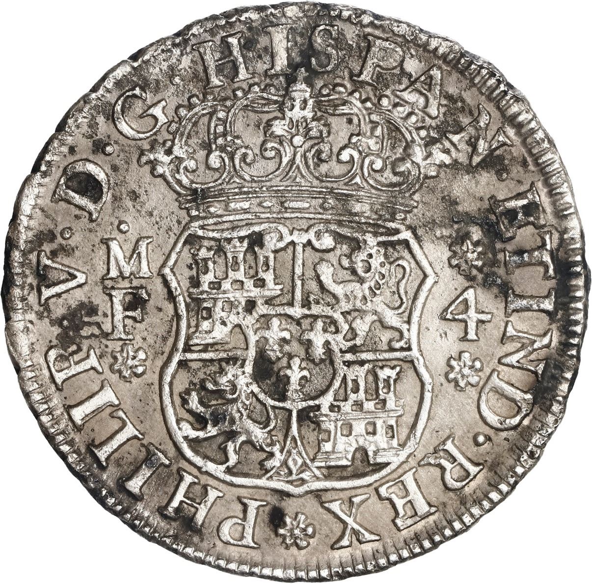 MEXICO, Mexico City, pillar 4 reales, Philip V, 1740/30 MF, ex-Brameld. Yonaka-M4.40a; KM-94; Cal-1122. 12.77 grams. Corroded (more so on the pillars side) with spots of dark encrustation yet otherwise solid and with full details including clear overdate. Pedigreed to the David Brameld Collection. Recovered from: Hollandia, sunk in 1743 off the Isles of Scilly, southwest of England