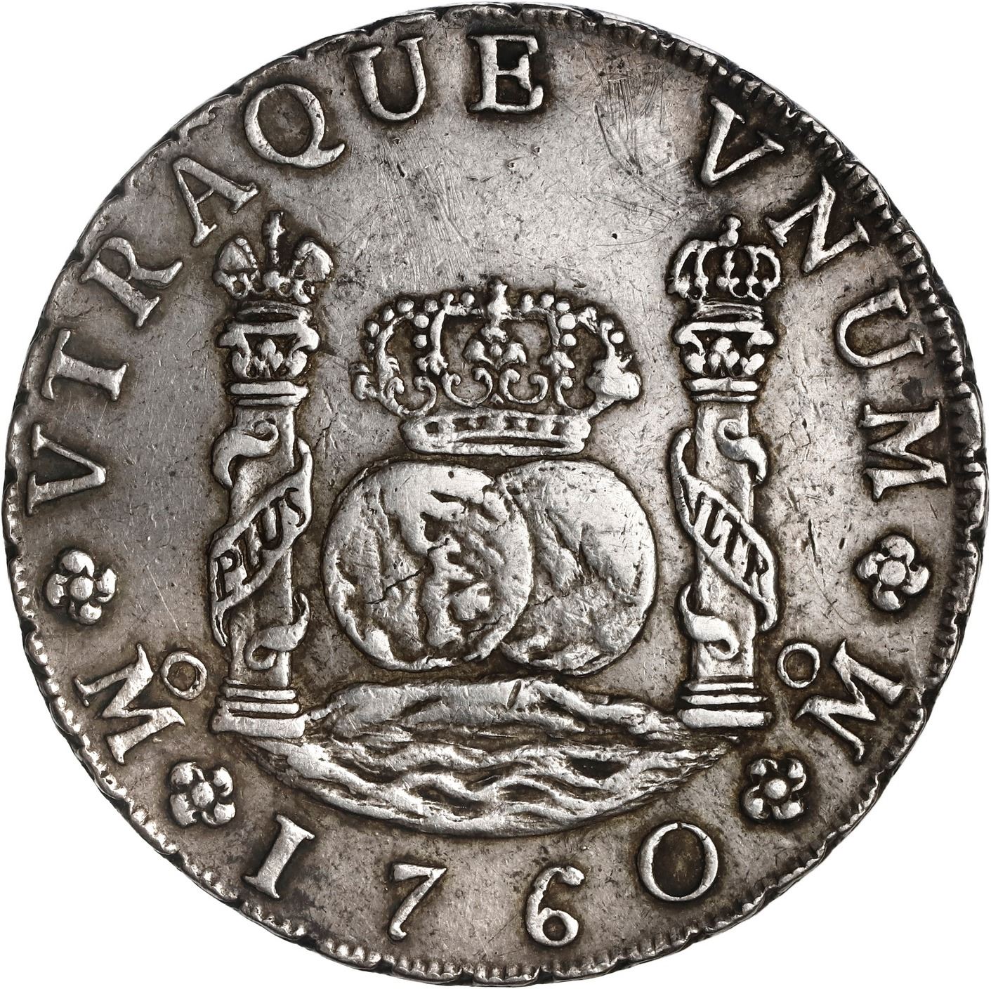 MEXICO, Mexico City, pillar 8 reales, Charles III, 1760 MM, ex-Brameld. Yonaka-M8.60b; Cal-1073; KM-105. 26.95 grams. Lightly toned AU- with contrasting sediment around details, a few marks and hairlines over subtle luster. Pedigreed to the David Brameld Collection.