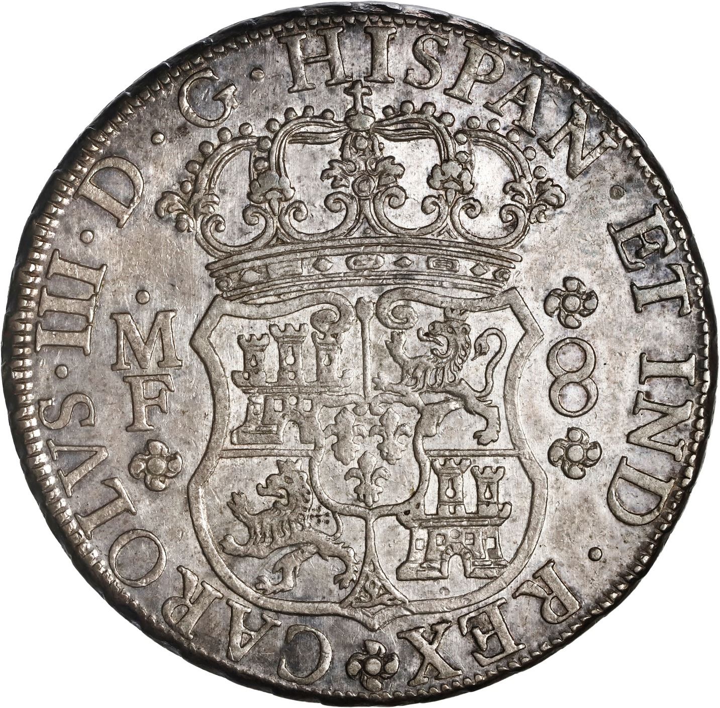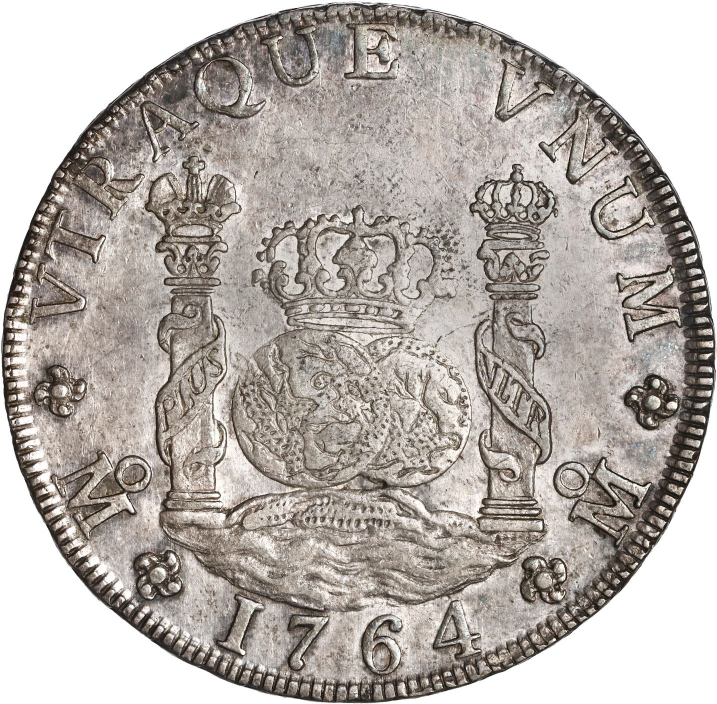 MEXICO, Mexico City, pillar 8 reales, Charles III, 1764 MF, crown with lower arc above globes, ex-Br