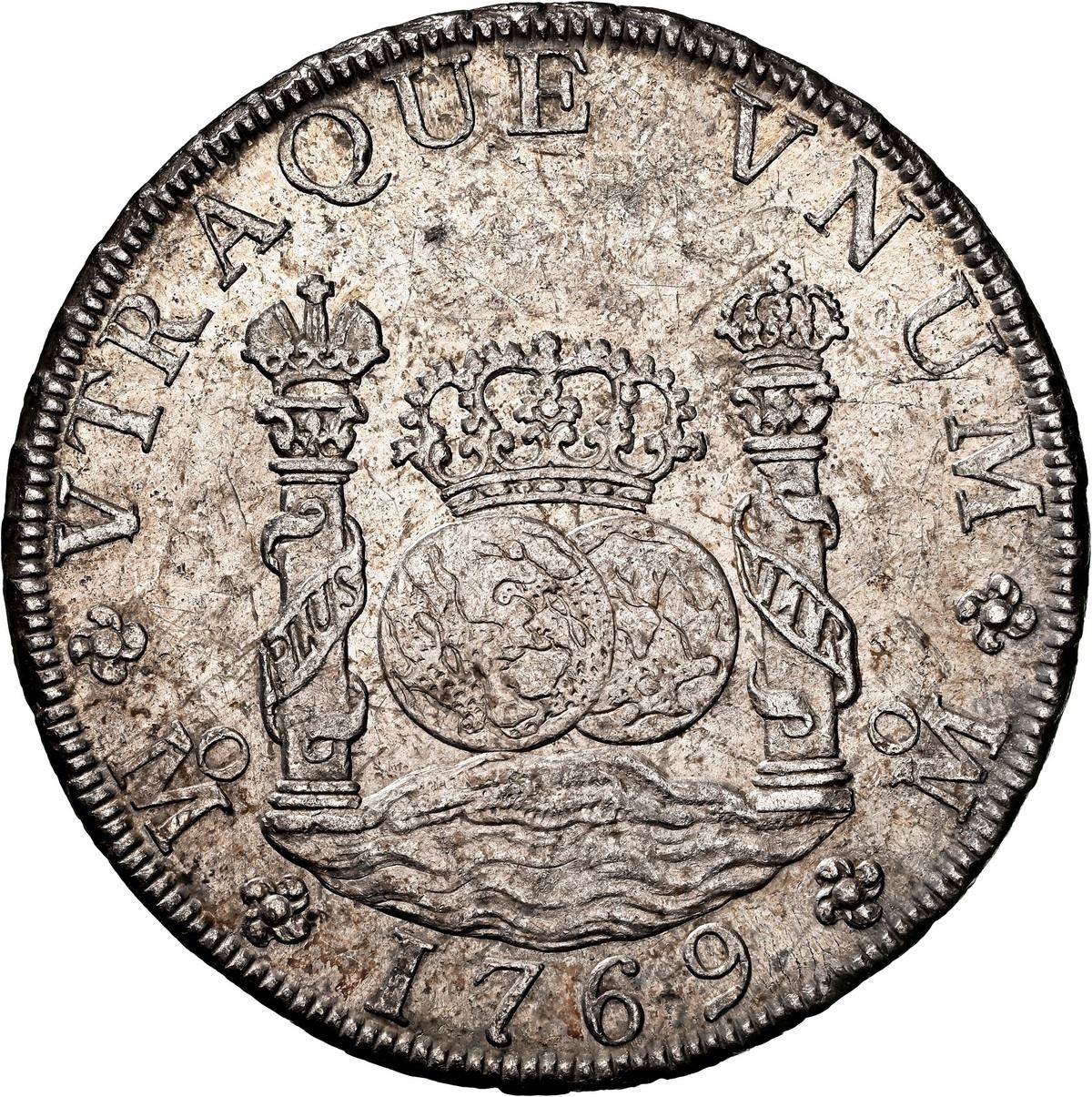 MEXICO, Mexico City, pillar 8 reales, Charles III, 1769 MF, NGC AU 58, ex-Tan. Yonaka-M8.69; KM-105; Cal-1095. Choice luster for the assigned grade, with light golden toning all over, a modicum of small marks, good strike with full rims, slight die-buckling. Pedigreed to the Patrick Tan Collection (CNG Triton auction of January 2011, lot 1616).