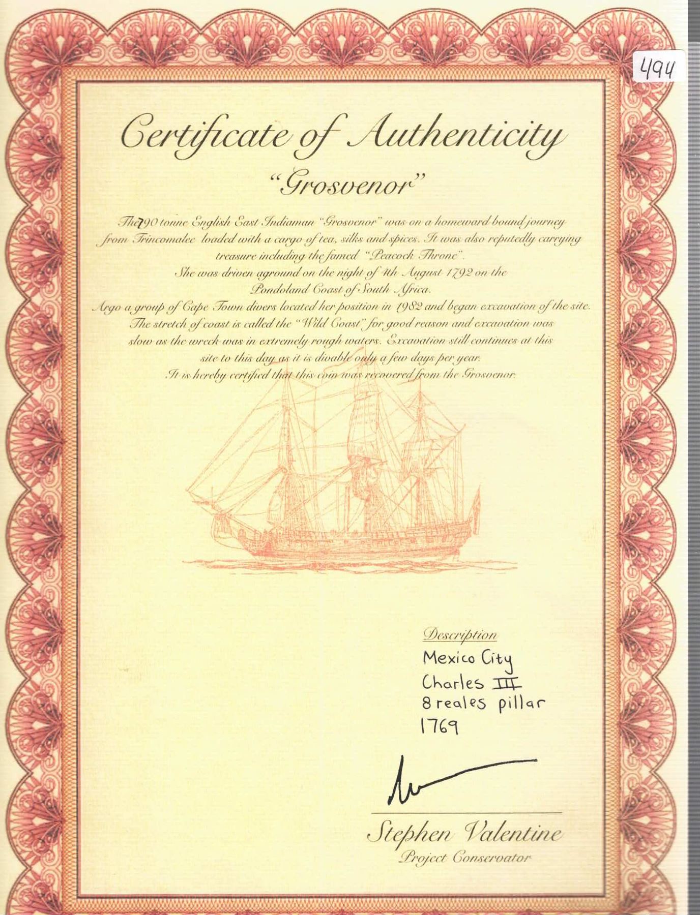 MEXICO, Mexico City, pillar 8 reales, Charles III, 1769 MF. Yonaka-M8.69; Cal-1095; KM-105. 26.97 grams. Bold XF details with light golden toning, no corrosion but some heavy marks and large bruise on edge. Pedigreed to the Steve Valentine Collection, with original certificate from the salvor/conservator. Recovered from: Grosvenor, sunk in 1782 off South Africa