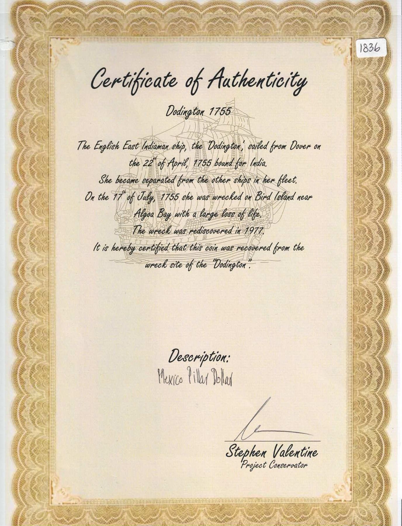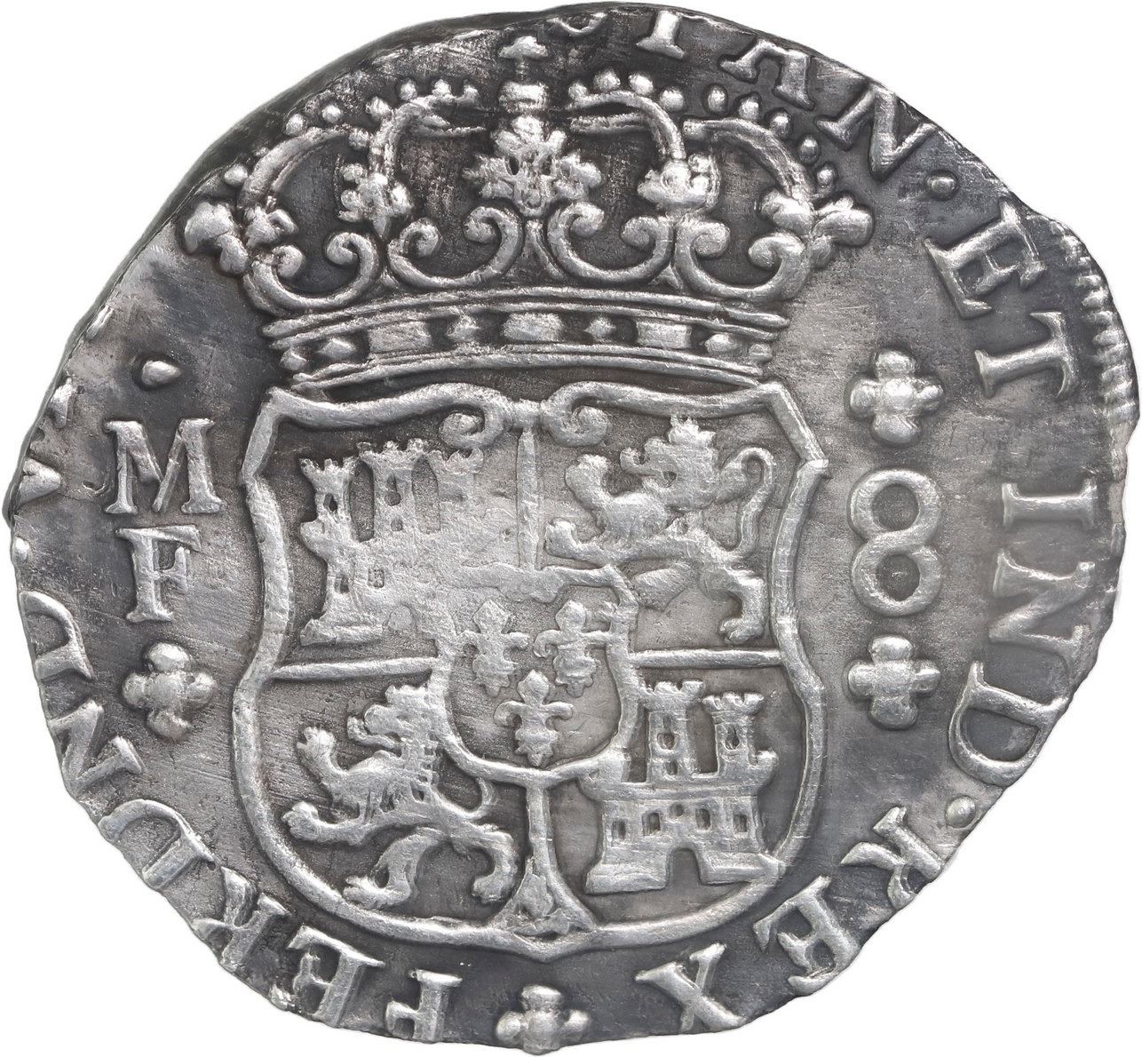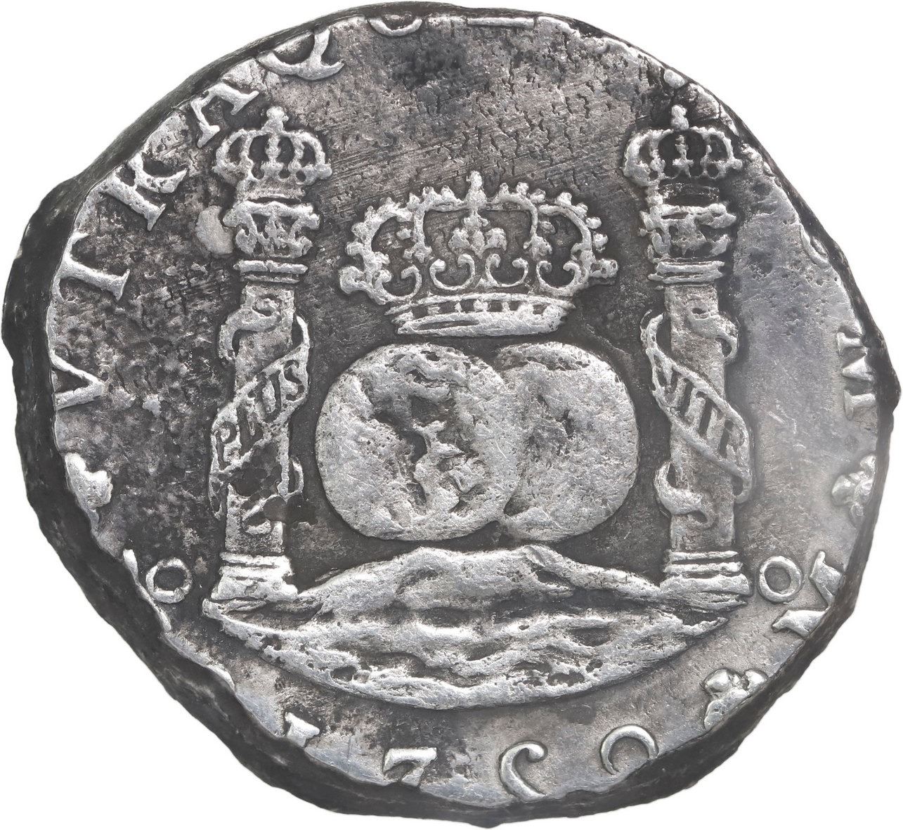 MEXICO, Mexico City, pillar 8 reales, Ferdinand VI, 1752 MF. Cal-477; KM-104.1; Yonaka-M8.52. 18.36 grams. Very unusual corrosion pattern with edges eaten into, yet with practically untouched central detail including a visible date and assayer, scarce provenance. With original certificate from the salvor/conservator. Recovered from: Dodington, sunk in 1755 off South Africa