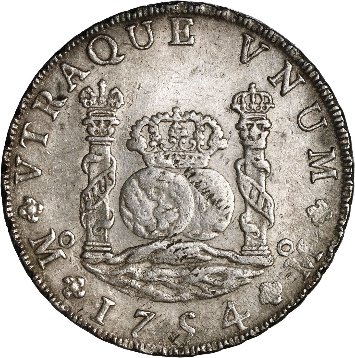 MEXICO, Mexico City, pillar 8 reales, Ferdinand VI, 1754 MF, dissimilar crowns, ex-Brameld.