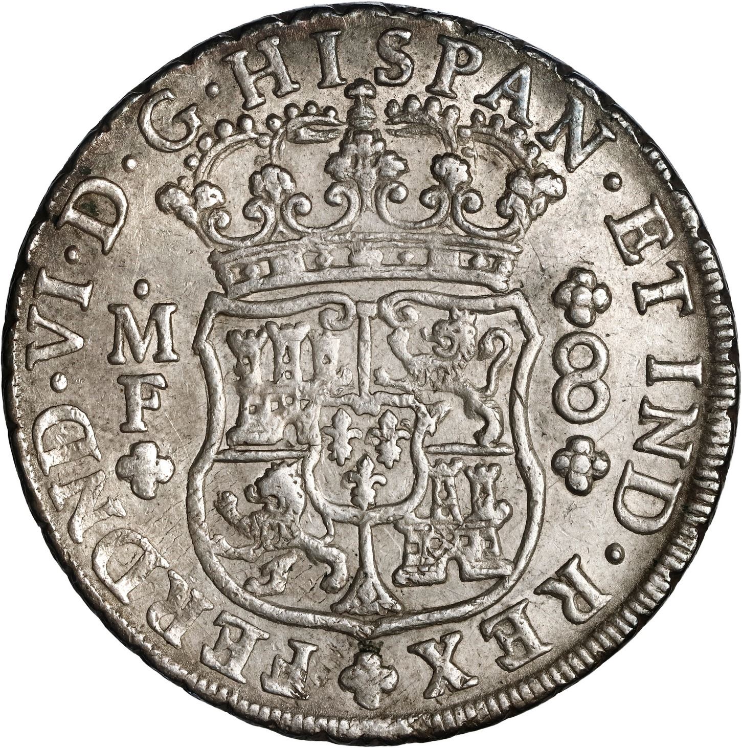 MEXICO, Mexico City, pillar 8 reales, Ferdinand VI, 1754 MF, dissimilar crowns, ex-Brameld. Yonaka-M8.54c; Cal-485; KM-104.2. 26.90 grams. Non-toned AU with muted luster, hairlines, scarce variety combining an older MF-assayer shield side with a newer pillars side with two different crowns above the pillars. Pedigreed to the David Brameld Collection.