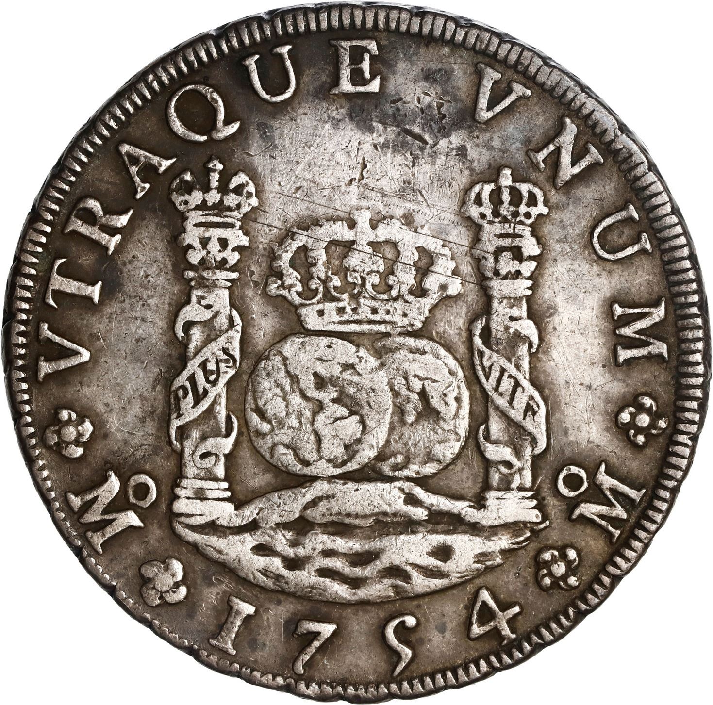 MEXICO, Mexico City, pillar 8 reales, Ferdinand VI, 1754 MM, dissimilar crowns, ex-Brameld. Yonaka-M8.54d; Cal-487; KM-104.2. 26.91 grams. XF with attractive toning over muted luster, typical marks and hairlines, light adjustment marks across crown between pillars. Pedigreed to the David Brameld Collection.