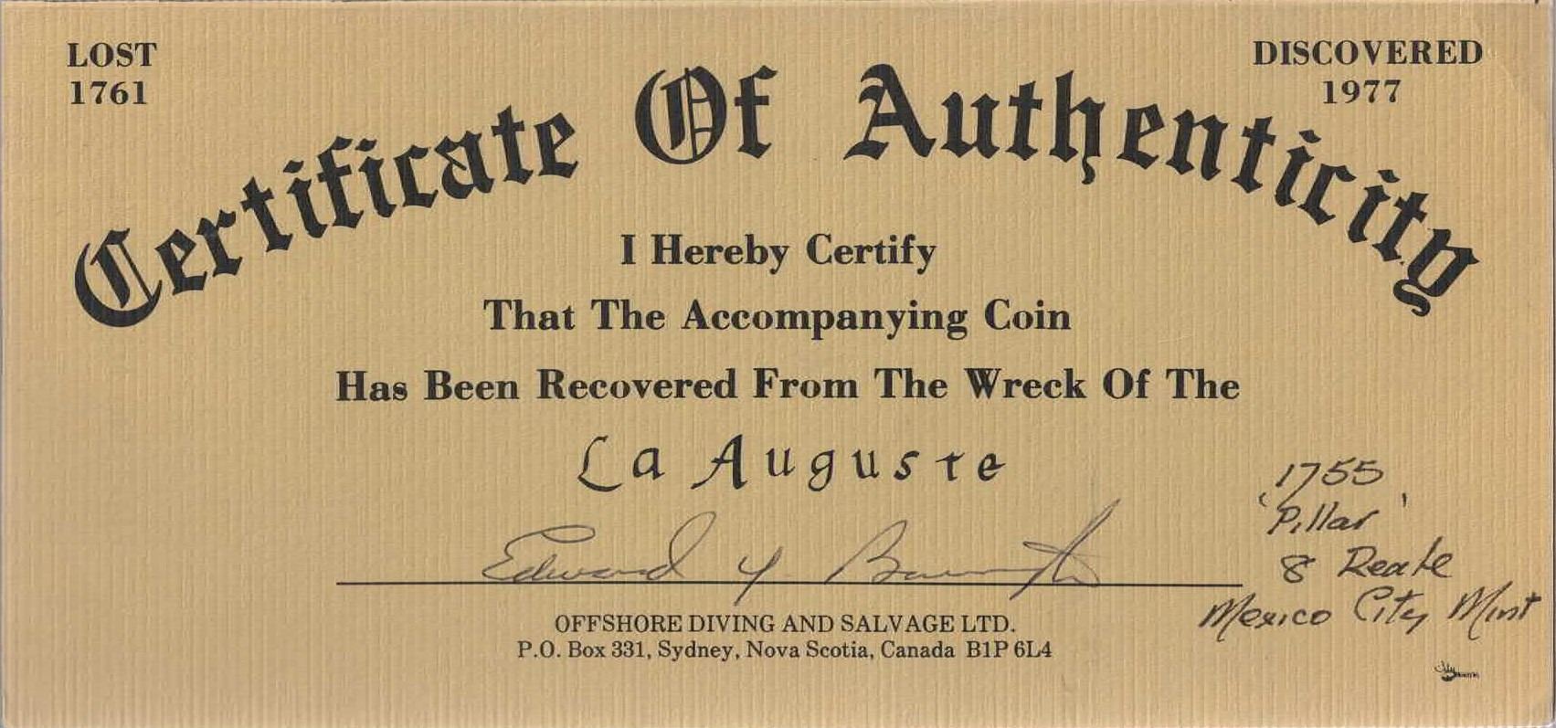 MEXICO, Mexico City, pillar 8 reales, Ferdinand VI, 1755 MM. Yonaka-M8.55; KM-104.2; Cal-489. 25.59 grams. Choice for this wreck with bold full XF details, very light surface corrosion, light toning, adjustment marks on globes. With original certificate from the salvors. Recovered from: La Auguste, sunk in 1761 off Nova Scotia, Canada