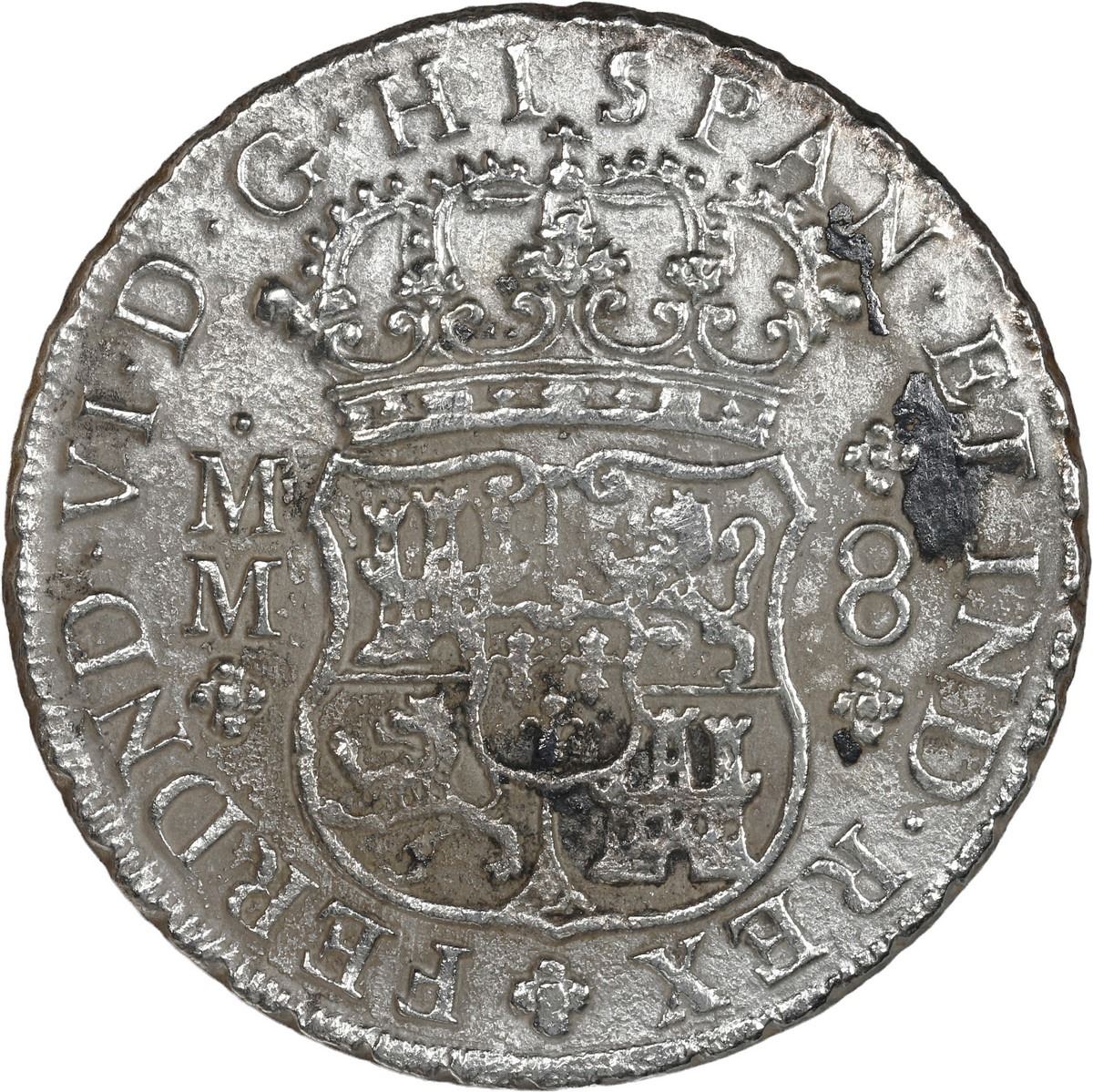 MEXICO, Mexico City, pillar 8 reales, Ferdinand VI, 1755 MM. Yonaka-M8.55; KM-104.2; Cal-489. 23.59 grams. Broad flan with XF+ details despite surface corrosion, mostly silvery from cleaning but a few dark spots, scarce booklet. With book The Wreck of the Auguste (Canadian Parks Service, 1992). Recovered from: La Auguste, sunk in 1761 off Nova Scotia, Canada