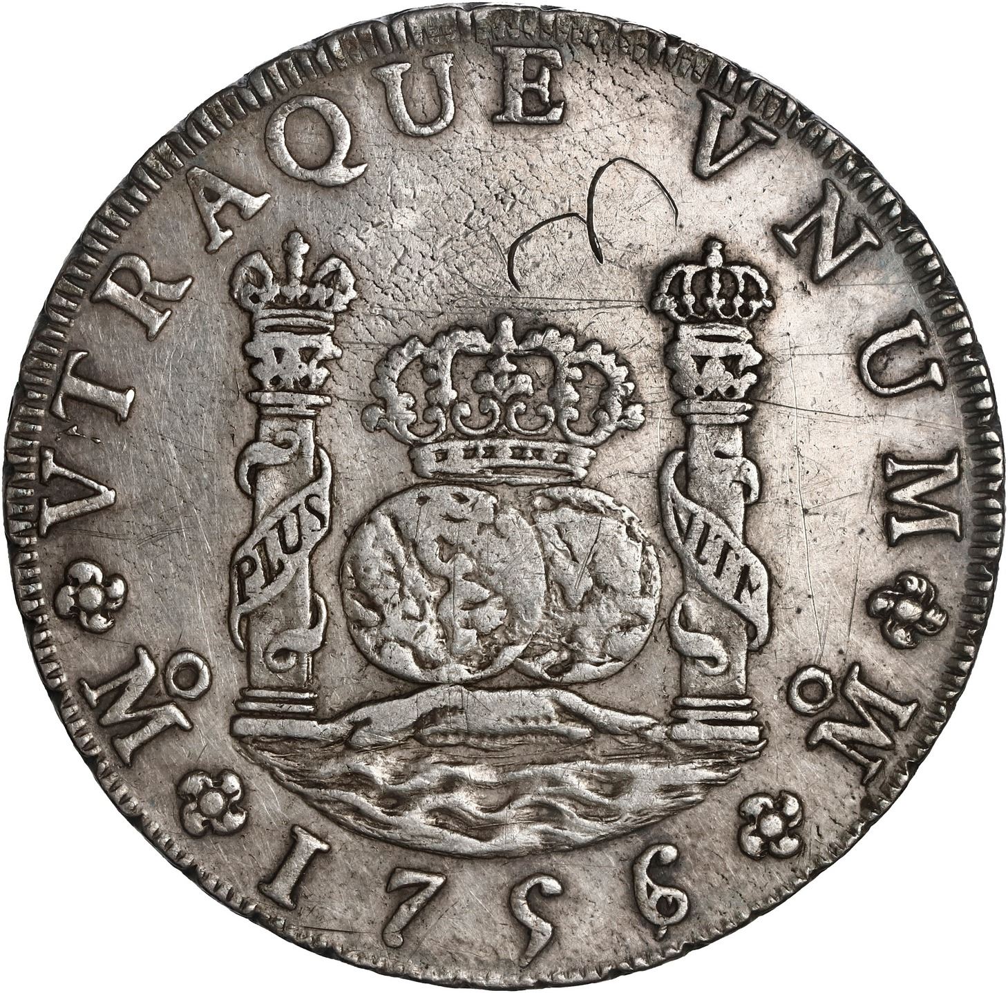 MEXICO, Mexico City, pillar 8 reales, Ferdinand VI, 1756/5 MM, ex-Brameld. Yonaka-M8.56a; Cal-490; KM-104.2. 26.92 grams. XF+ with luster but hairlined from old cleaning, with large "3" inscribed above crown and right pillar, very bold overdate. Pedigreed to the David Brameld Collection.