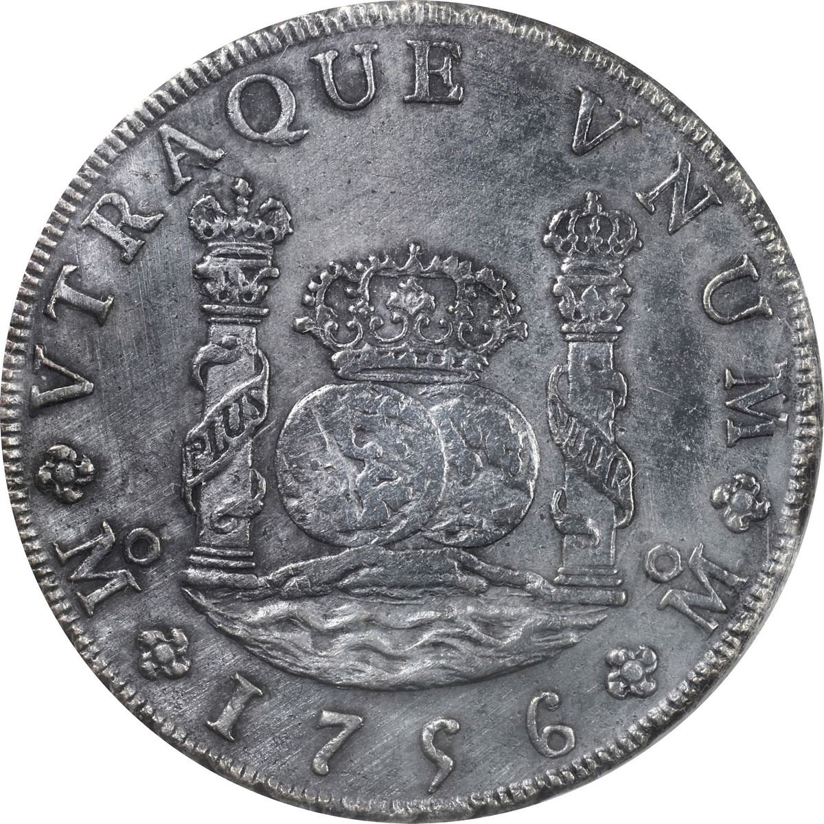 MEXICO, Mexico City, pillar 8 reales, Ferdinand VI, 1756 MM, ICCS EF-45, ex-CNA.Yonaka-M8.56; KM-104.1; Cal-491. Choice for this wreck with practically no corrosion, just darkly toned all over, more like AU details by today's standards. ICCS #ST 105. Pedigreed to the Canadian Numismatic Association auction of July 2008, lot 2551.