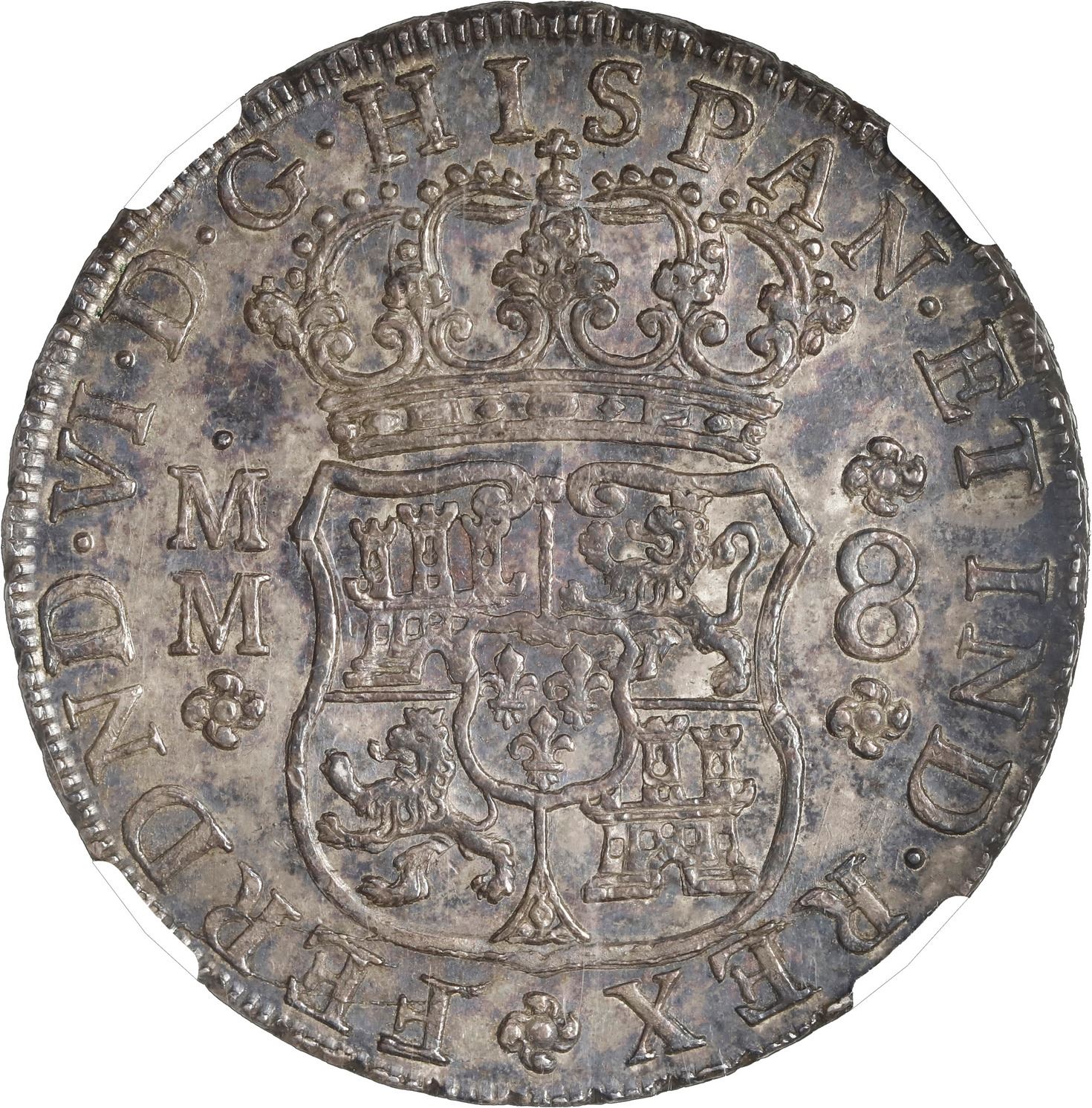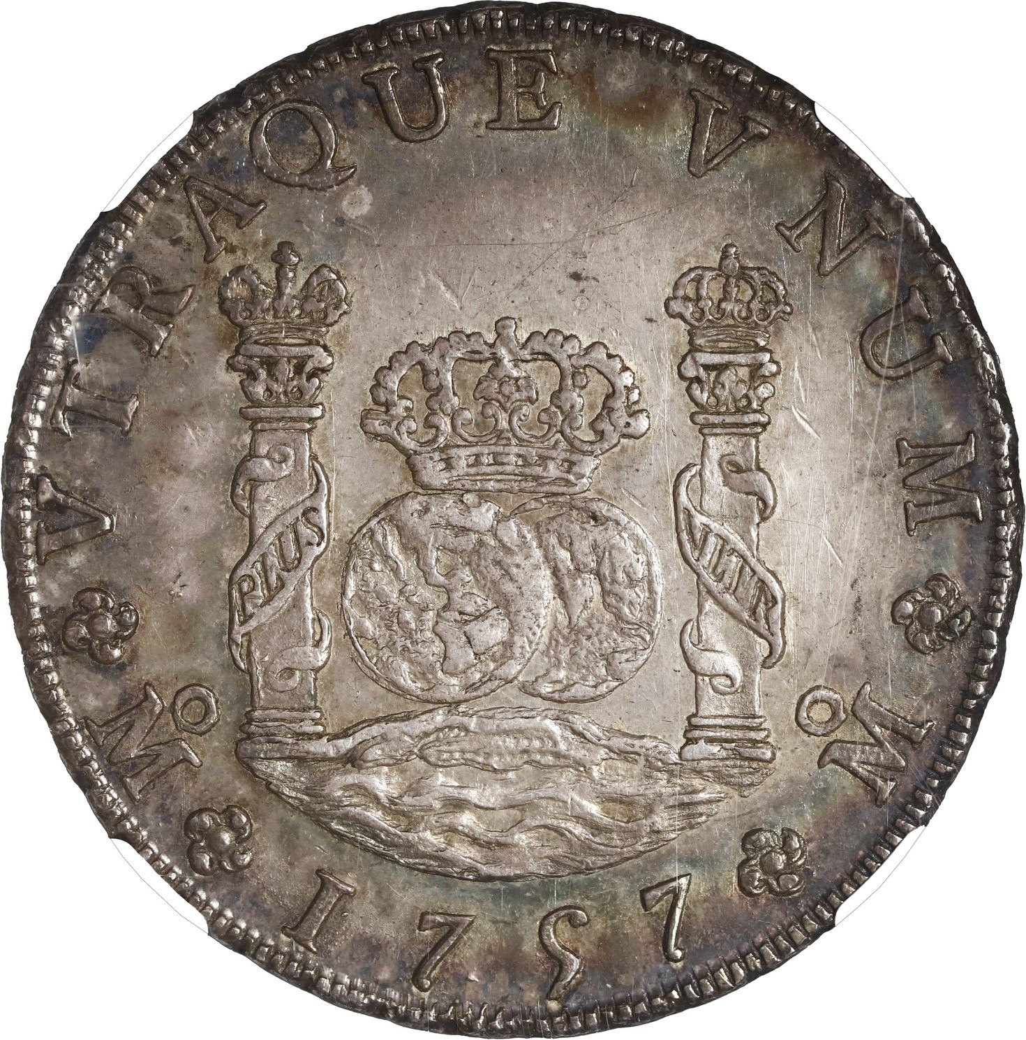 MEXICO, Mexico City, pillar 8 reales, Ferdinand VI, 1757/6 MM, NGC MS 62 (with gold WINGS sticker), finest known in NGC census. Yonaka-M8.57a; Cal-492; KM-104.2. A top-grade beauty with deep rainbow toning over luster throughout, very pretty and appealing on many levels, the overdate manifest as a faint arc above the 7.