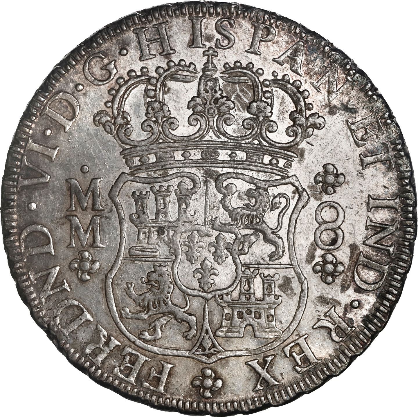 MEXICO, Mexico City, pillar 8 reales, Ferdinand VI, 1757 MM, closed wings in crown above left pillar