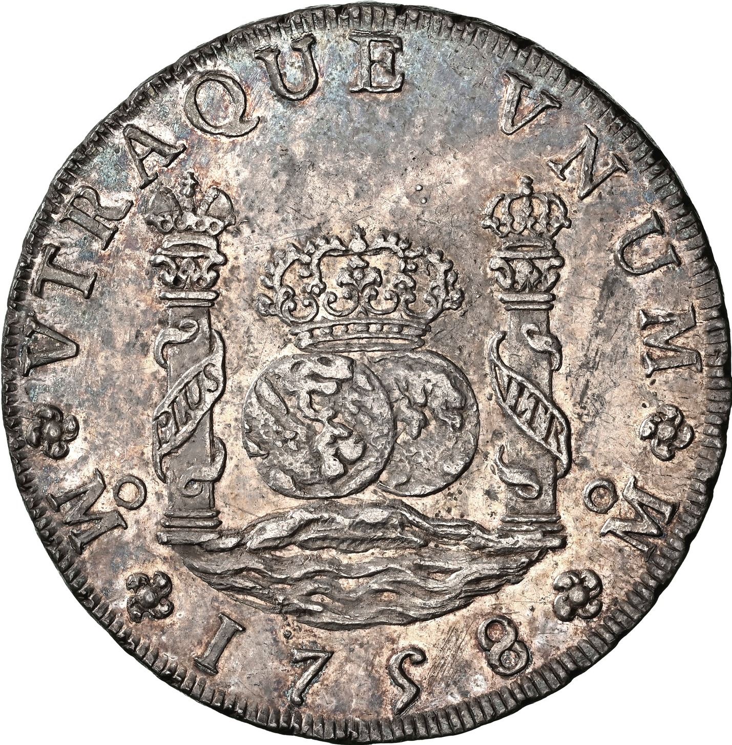 MEXICO, Mexico City, pillar 8 reales, Ferdinand VI, 1758 MM, NGC AU 58, ex-Brameld. Yonaka-M8.58; Cal-494; KM-104.2. Lustrous and choice, with splashes of rainbow toning, a date that does come nice like this. Pedigreed to the David Brameld Collection.