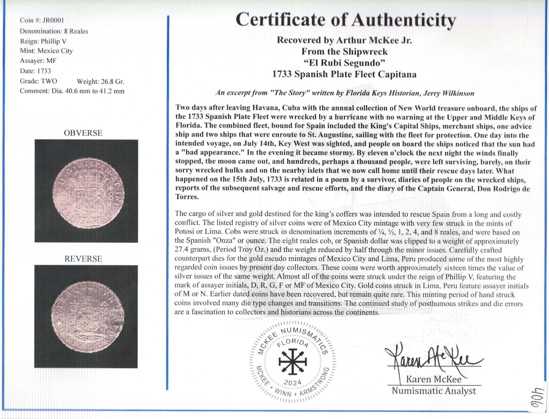 MEXICO, Mexico City, pillar 8 reales, Philip V, 1733/2 MF, small crown, very rare, ex-Eidel. Yonaka-M8.33D3; KM-103; Cal-1439. 26.83 grams. Broad flan with full rims and sharp AU+ details despite traces of minor surface corrosion and many little bumps and nicks, much remaining luster, additionally desirable as a very rare overdate (only traces of under-digit visible, matching photo in Yonaka). Pedigreed to the Charles Eidel Collection (Sedwick Auction 20, with original lot-tag 496), with photo-certificate. Recovered from: Spanish 1733 Fleet, Florida Keys