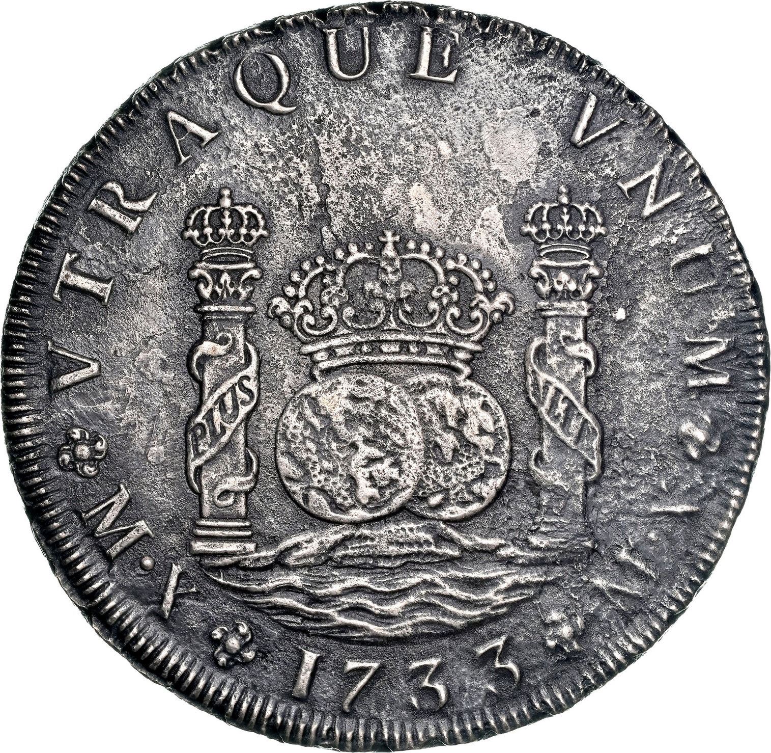 MEXICO, Mexico City, pillar 8 reales, Philip V, 1733 F, mintmark M•X, very rare, NGC XF details / sea salvaged (Shipwreck Blue Label), ex-Reijgersdaal (1747). KM-103; Cal-1435; Yonaka-M8.33B. Choice full details with deep toning over acceptably light surface corrosion, desirable as an example of the brief issue (part of 1733 only) in which Mexico used an MX mintmark, even damaged examples of which bring five figures, great for any Mexican collection but also appealing as a top-quality shipwreck coin.
