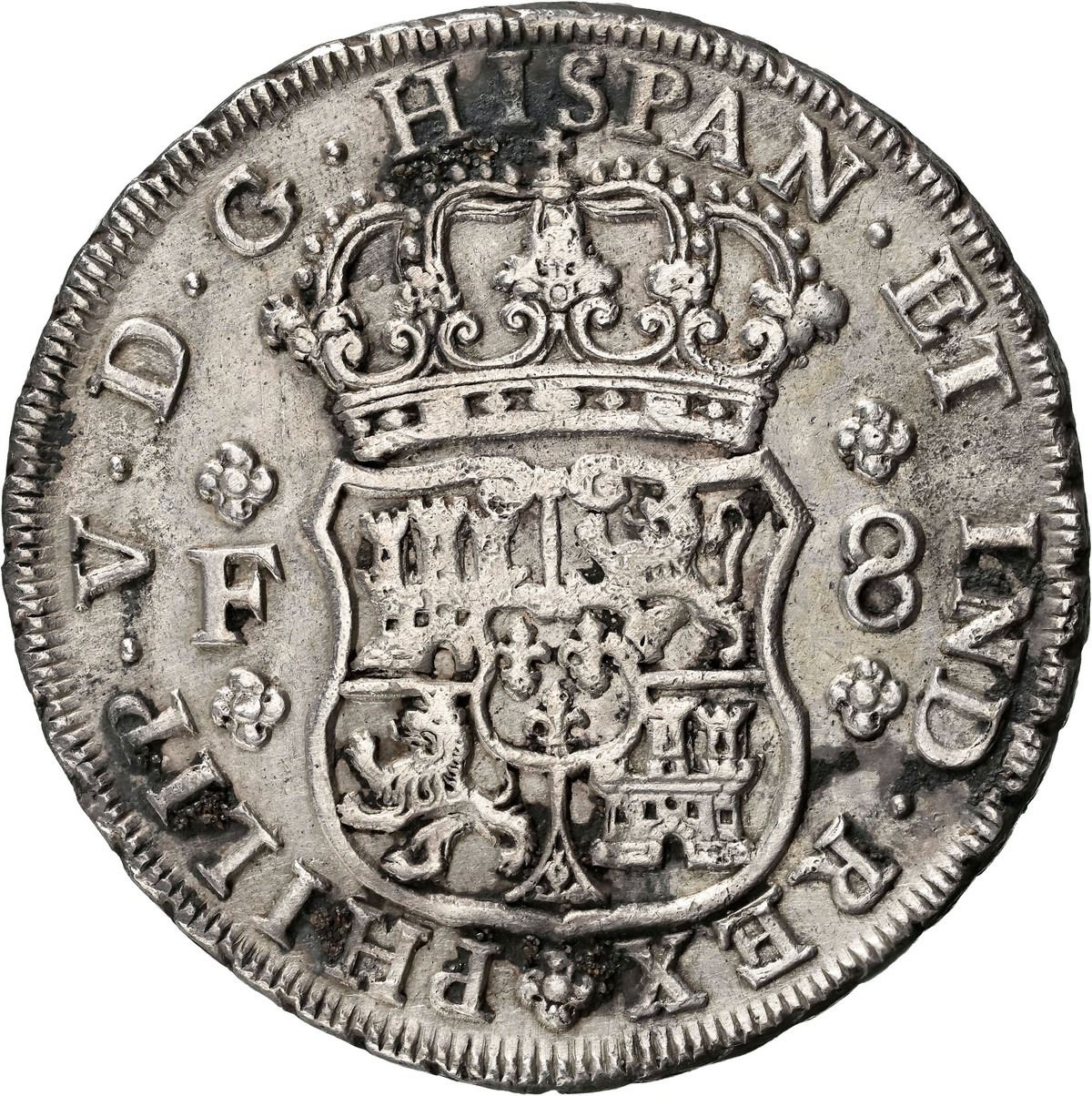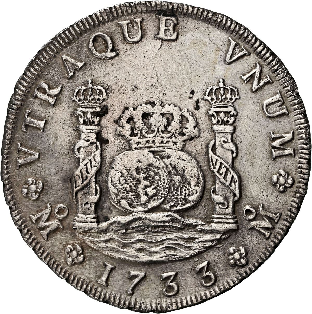 MEXICO, Mexico City, pillar 8 reales, Philip V, 1733 F, small crown, rare, NGC AU details / harshly cleaned (Shipwreck Blue Label). Yonaka-M8.33a; KM-103; Cal-1438. Broad flan with full rims, no corrosion but several spots of dark "horn" silver on shield side, very lightly toned overall. Recovered from: Rooswijk, sunk in 1739 southeast of England