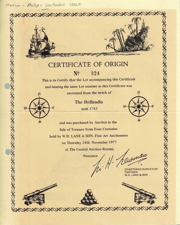 MEXICO, Mexico City, pillar 8 reales, Philip V, 1735 MF, ex-Brameld, ex-Lane. Yonaka-M8.35; KM-103; Cal-1443. 26.58 grams. AU details with practically no corrosion, traces of luster on fields, very light golden toning, quite nice for this wreck. Pedigreed to the David Brameld Collection and the W.H. Lane auction of November 1977 (lot 358), with original certificate. Recovered from: Hollandia, sunk in 1743 off the Isles of Scilly, southwest of England