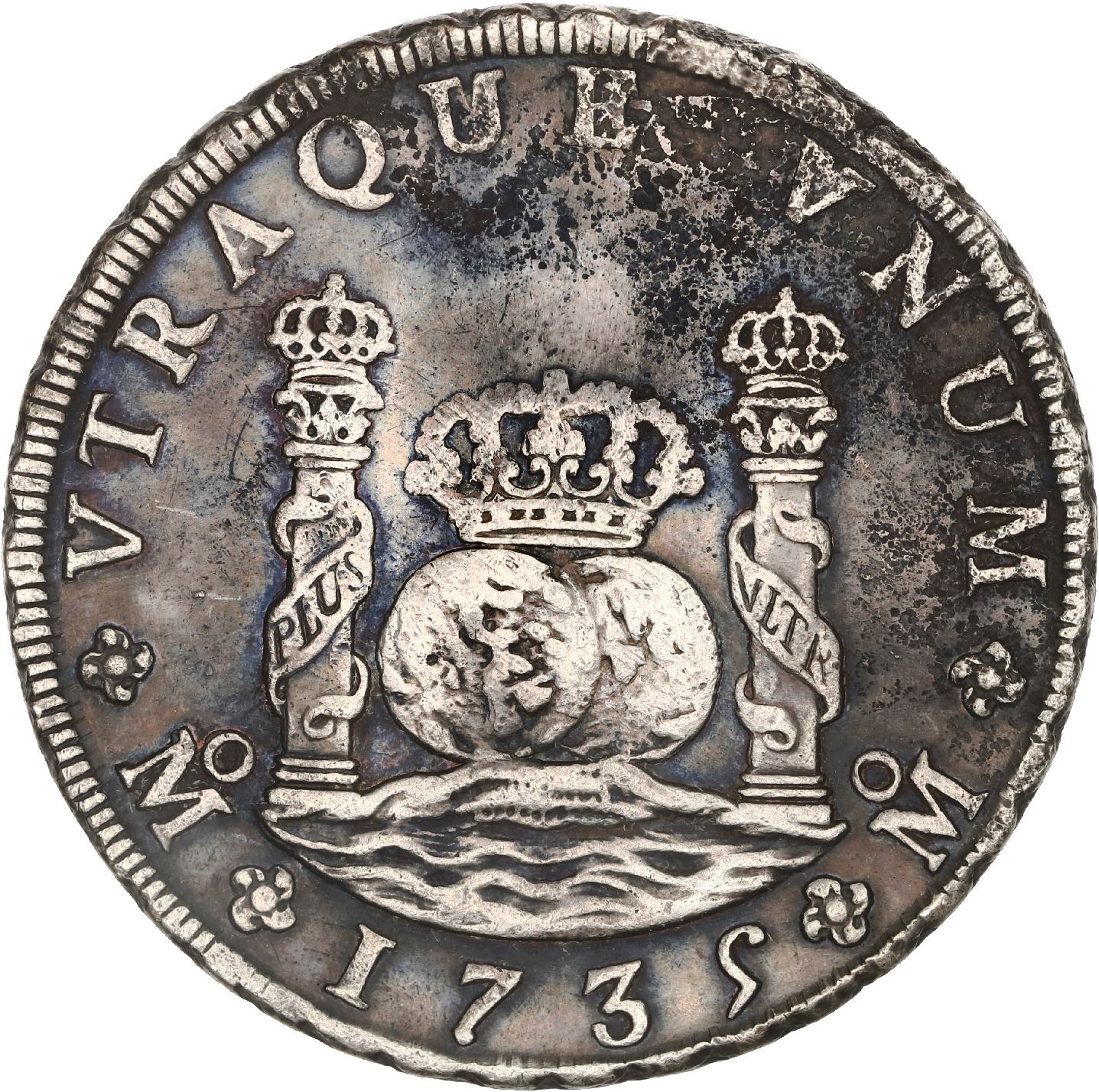 MEXICO, Mexico City, pillar 8 reales, Philip V, 1735 MF. Yonaka-M8.35; KM-103; Cal-1443. 26.49 grams. Typically choice AU details with beautiful contrasting toning, mostly corrosion-free but a couple areas of light pitting. Recovered from: Reijgersdaal, sunk in 1747 off South Africa