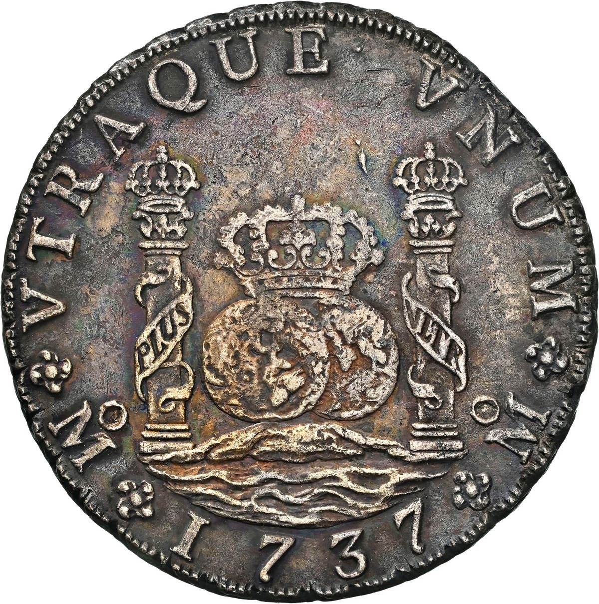 MEXICO, Mexico City, pillar 8 reales, Philip V, 1737 MF, NGC AU details / saltwater damage (Shipwreck Blue Label). Yonaka-M8.37; KM-103; Cal-1446. Choice example, virtually corrosion-free with very deep, rich toning all over, full rims. Recovered from: Reijgersdaal, sunk in 1747 off South Africa