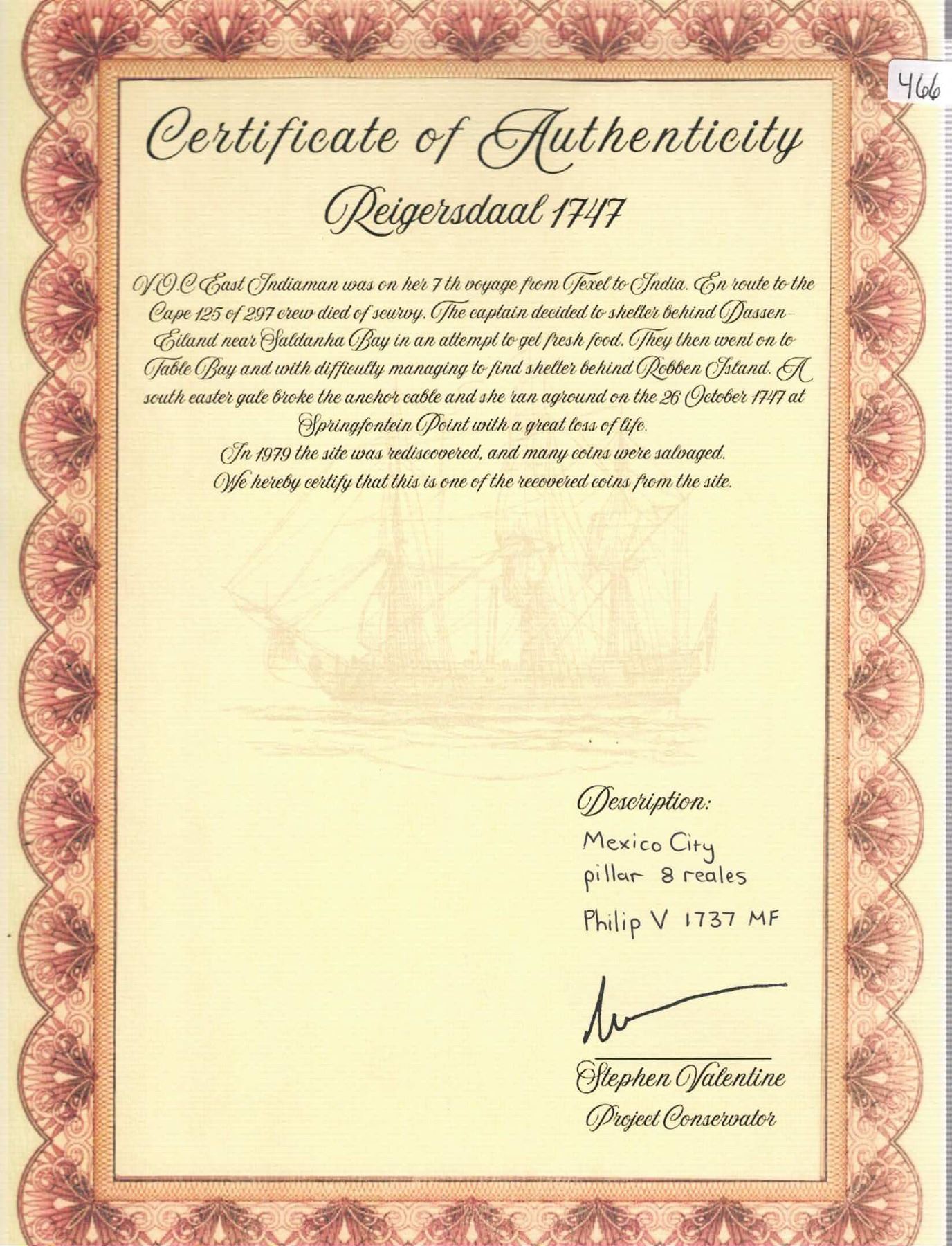 MEXICO, Mexico City, pillar 8 reales, Philip V, 1737 MF. Yonaka-M8.37; KM-103; Cal-1446. 26.65 grams. Corrosion-free AU- with light toning, full rims but with dent near top edge that caused a slight bend. Pedigreed to the Steve Valentine Collection, with original certificate from the salvor/conservator. Recovered from: Reijgersdaal, sunk in 1747 off South Africa
