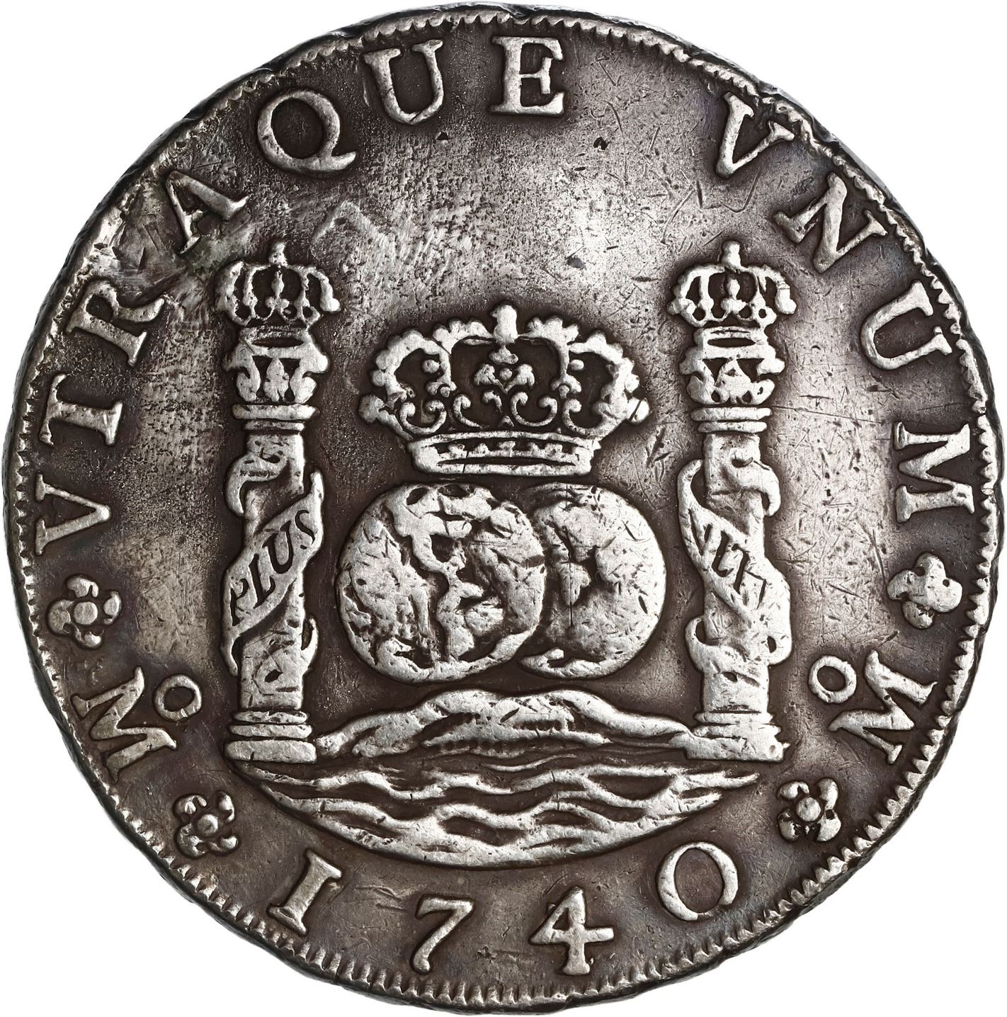 MEXICO, Mexico City, pillar 8 reales, Philip V, 1740/30 MF, ex-Brameld. Yonaka-M8.40a; Cal-1454; KM-103. 26.77 grams. Non-salvage AXF with purplish toning around details, crudely plugged and repaired hole between R and A of VTRA. Pedigreed to the David Brameld Collection.