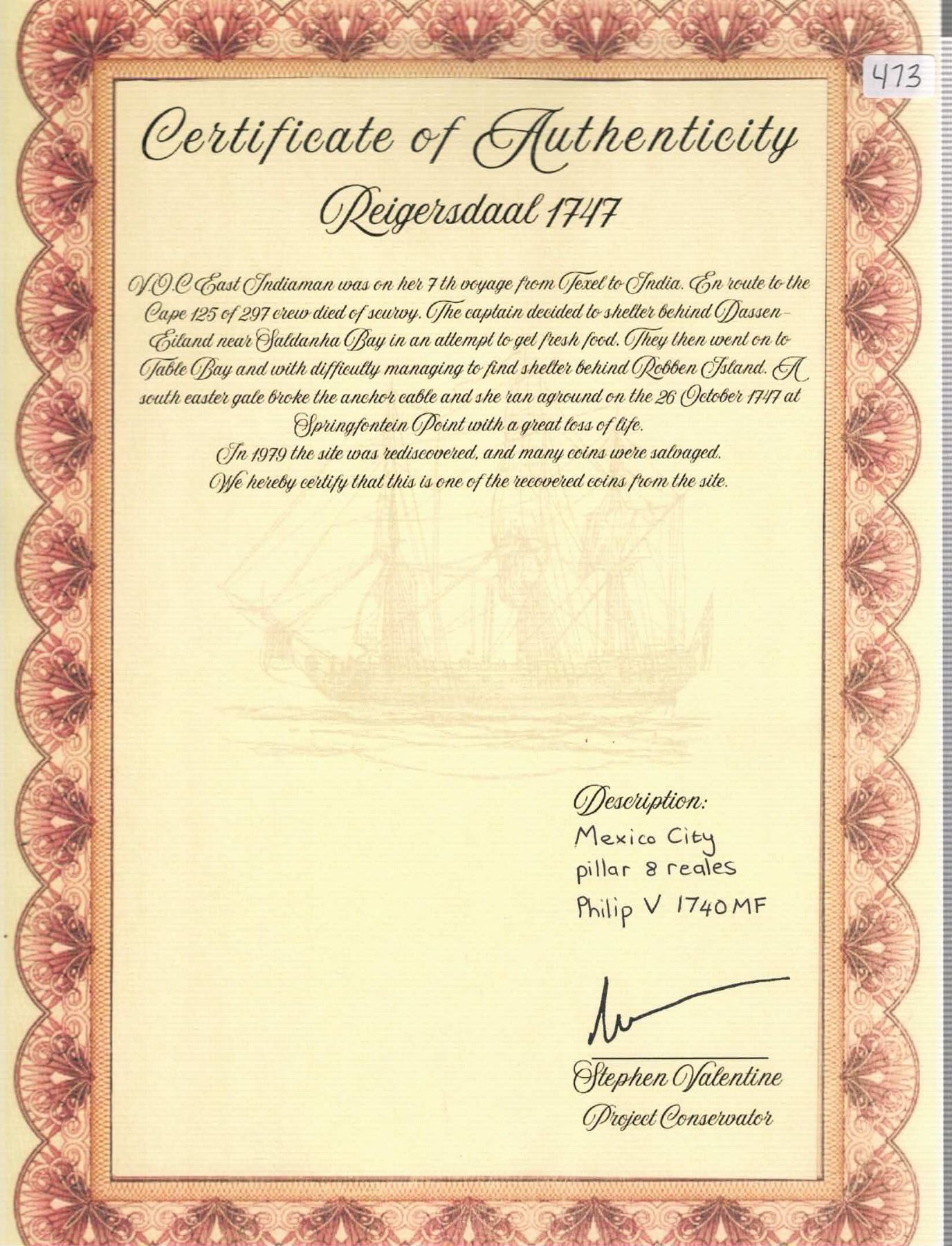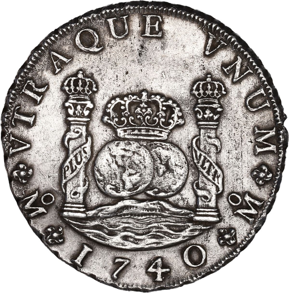 MEXICO, Mexico City, pillar 8 reales, Philip V, 1740/30 MF. Yonaka-M8.40; KM-103; Cal-1454. 26.81 grams. Choice example with sharp AU details and virtually no corrosion, very faint light toning, slightly out-of-round flan (as made). Pedigreed to the Steve Valentine Collection, with original certificate from the salvor/conservator. Recovered from: Reijgersdaal, sunk in 1747 off South Africa