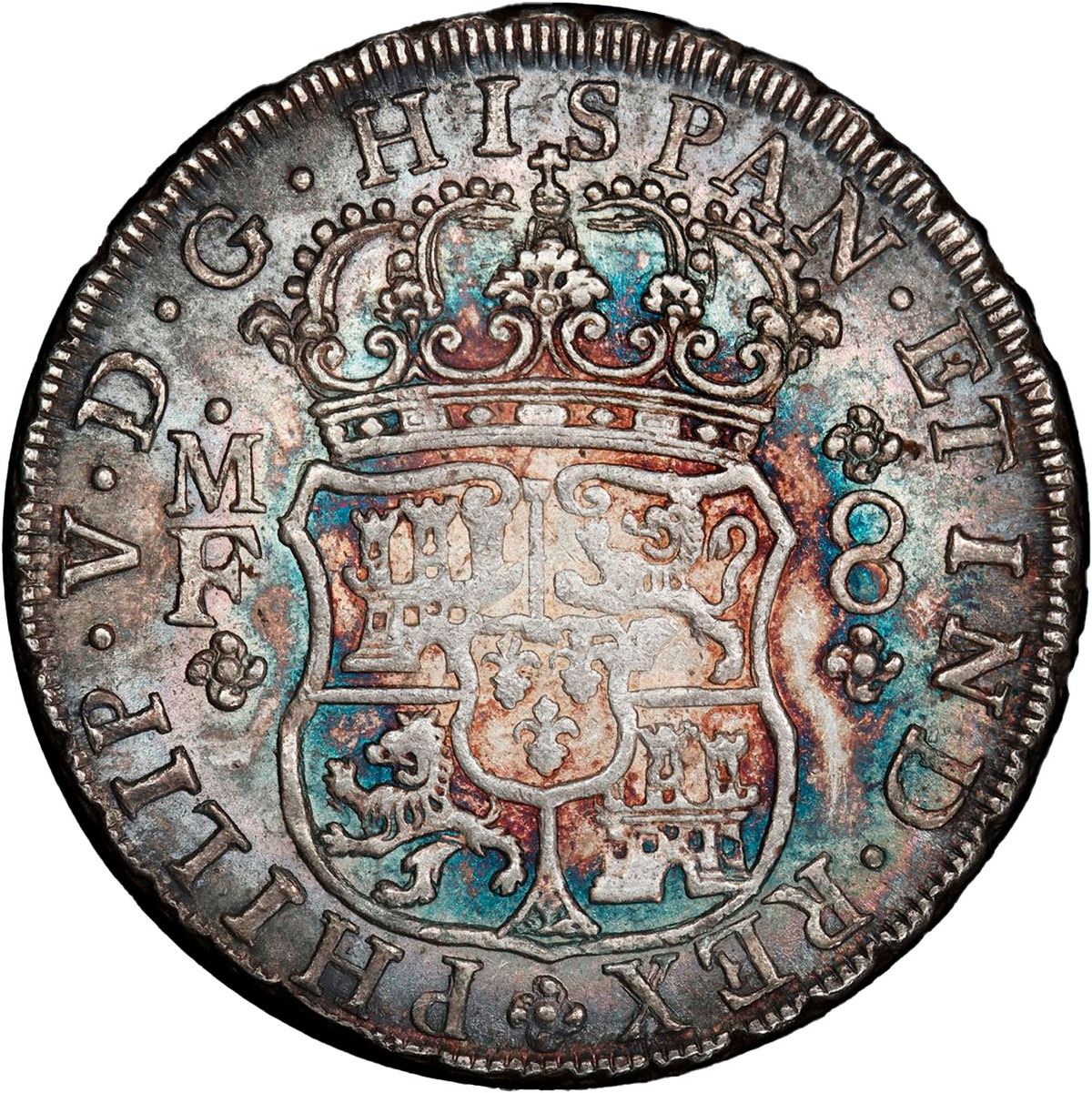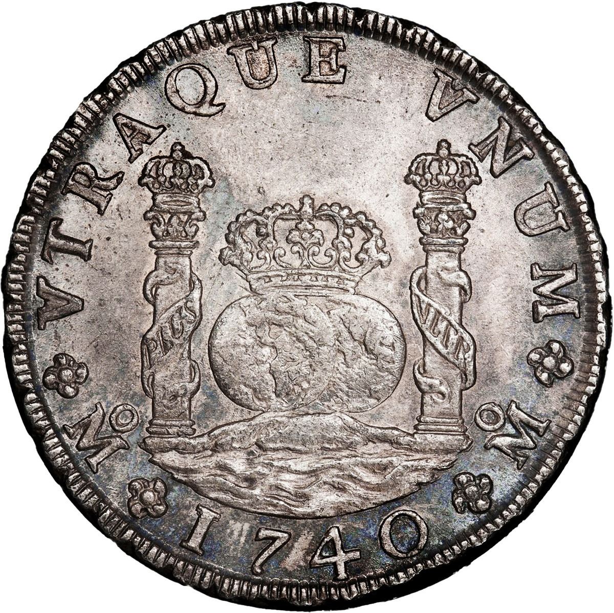 MEXICO, Mexico City, pillar 8 reales, Philip V, 1740 MF, PCGS MS62, ex-Espinola. Yonaka-M8.40; KM-103; Cal-1456. Deeply rainbow toned with the reverse exhibiting a ring of bright blue around the shield, full rims, choice grade (among the top 10% of any certified examples). Pedigreed to the Espinola Collection.