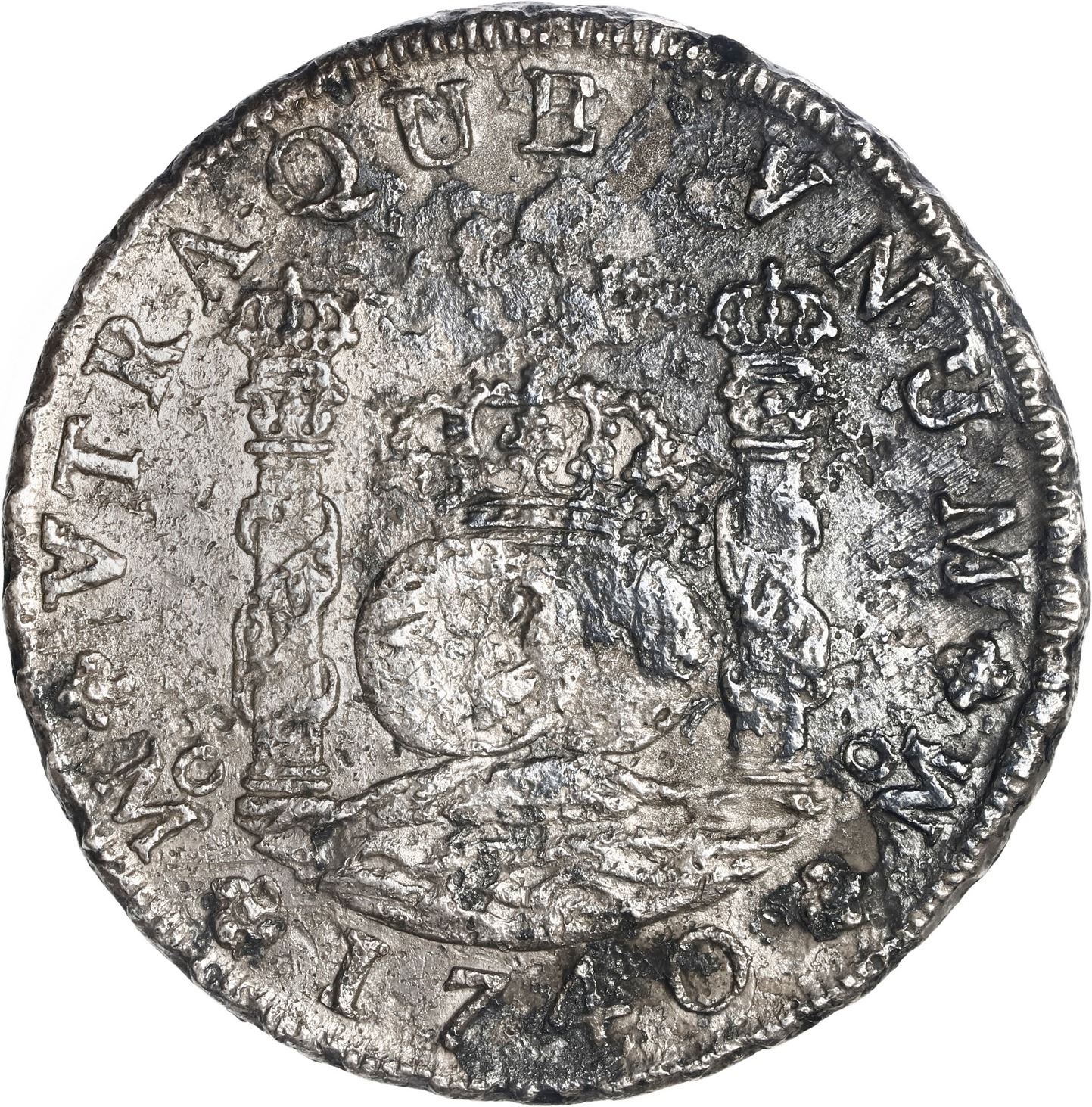 MEXICO, Mexico City, pillar 8 reales, Philip V, 1740 MF, ex-Brameld. Yonaka-M8.40; KM-103; Cal-1456. 25.67 grams. Solid piece with surface corrosion and patchy dark encrustation yet fully detailed. Pedigreed to the David Brameld Collection. Recovered from: Hollandia, sunk in 1743 off the Isles of Scilly, southwest of England