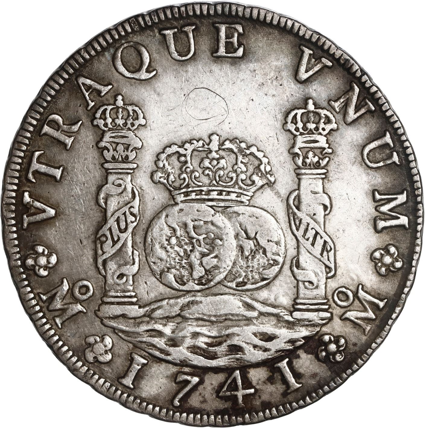 MEXICO, Mexico City, pillar 8 reales, Philip V, 1741 MF, ex-Brameld. Yonaka-M8.41; Cal-1458; KM-103. 26.86 grams. Well-struck, non-salvage AU- with toning around details, circular graffito in field above crown and small test-cut on shield-side rim, hairlined fields. Pedigreed to the David Brameld Collection.