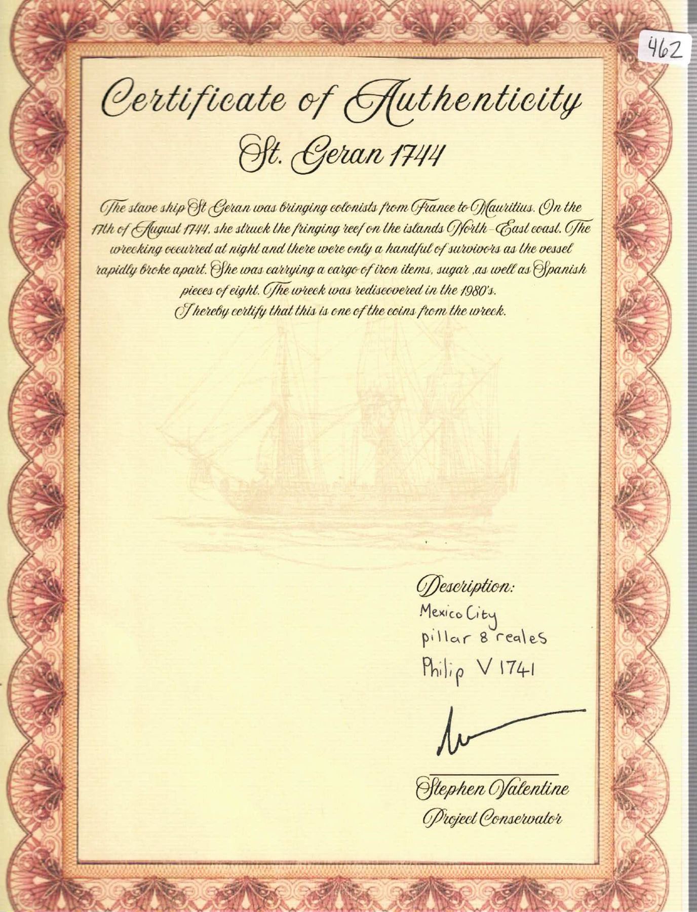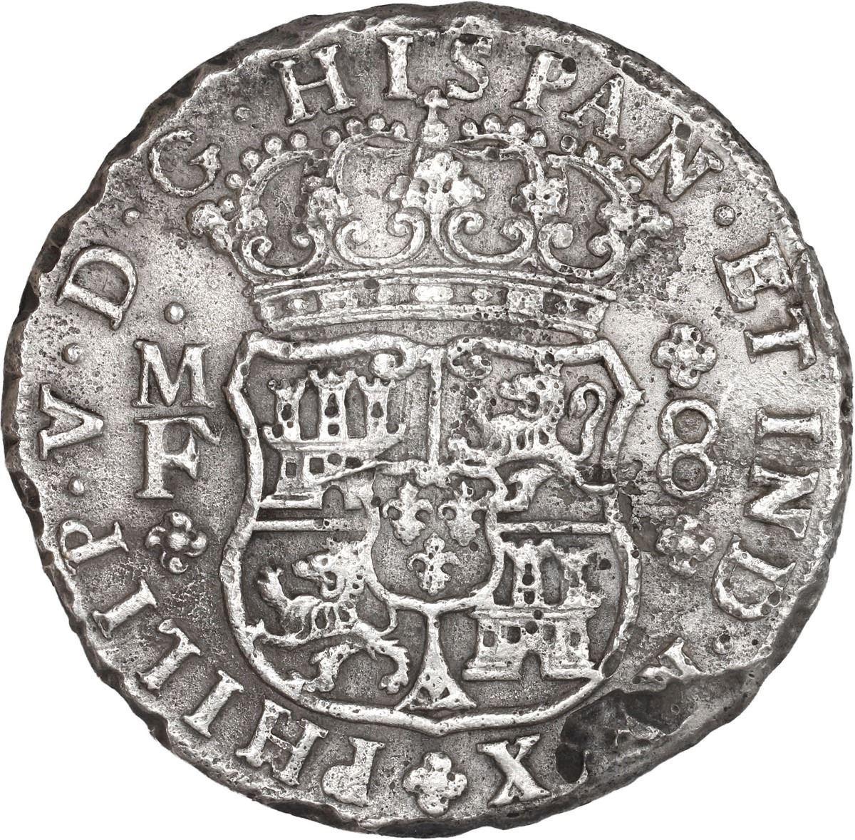 MEXICO, Mexico City, pillar 8 reales, Philip V, 1741 MF. Yonaka-M8.41; KM-103; Cal-1458. 24.49 grams. Bold AU details with light contrasting toning but some surface pitting and corrosion on edge. Pedigreed to the Steve Valentine Collection, with original certificate from the salvor/conservator. Recovered from: St. Geran, sunk in 1744 off Mauritius in the Indian Ocean