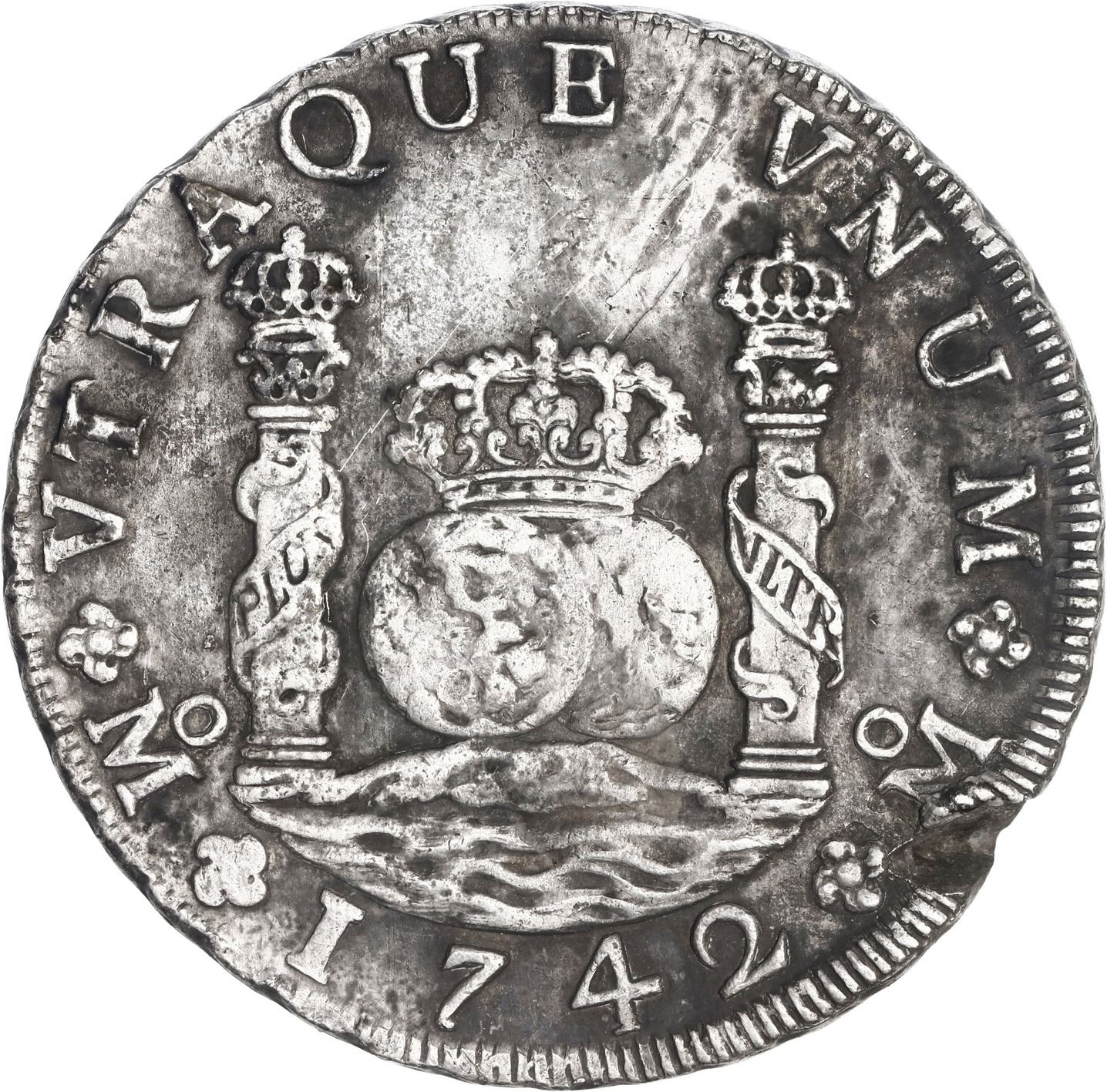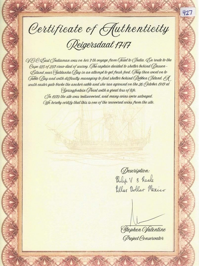 MEXICO, Mexico City, pillar 8 reales, Philip V, 1742 MF. Yonaka-M8.42; KM-103; Cal-1461. 26.93 grams. Bold AU details with nicely contrasting toning and practically no corrosion but notched in pillars-side rim (either as made or pre-salvage damage). Pedigreed to the Steve Valentine Collection, with original certificate from the salvor/conservator. Recovered from: Reijgersdaal, sunk in 1747 off South Africa