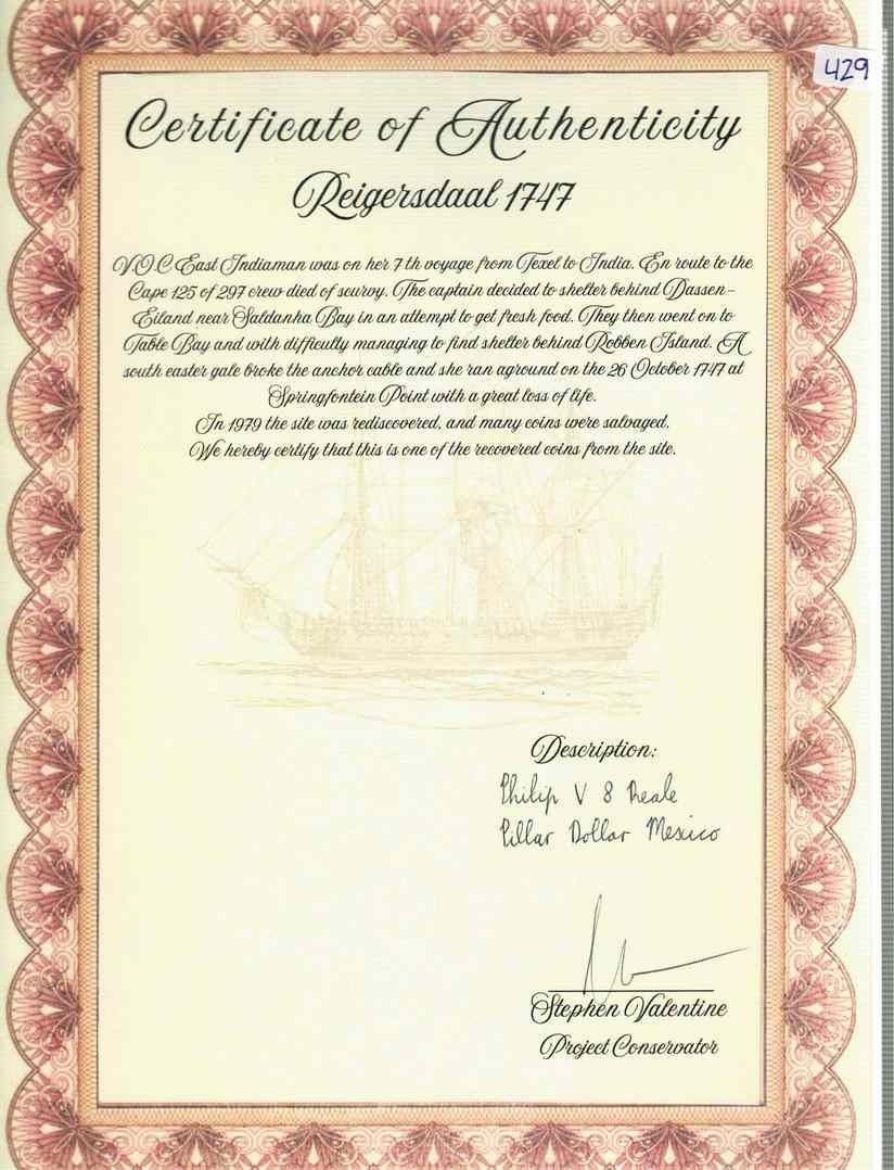 MEXICO, Mexico City, pillar 8 reales, Philip V, 1743 MF. Yonaka-M8.43; KM-103; Cal-1463. 26.52 grams. Choice example with AU details and very light toning, virtually corrosion-free but low in contrast. Pedigreed to the Steve Valentine Collection, with original certificate from the salvor/conservator. Recovered from: Reijgersdaal, sunk in 1747 off South Africa