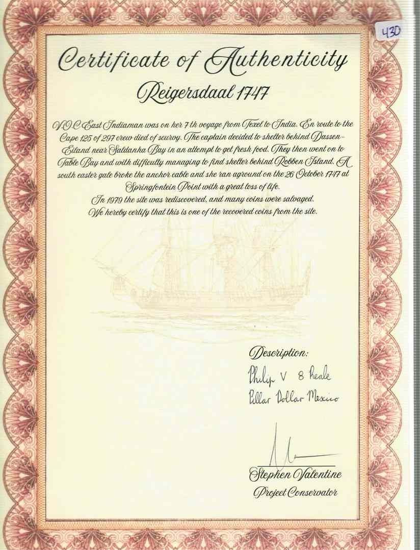 MEXICO, Mexico City, pillar 8 reales, Philip V, 1743 MF. Yonaka-M8.43; KM-103; Cal-1463. 26.19 grams. Bold AU details, toned all over, traces of light corrosion here and there. Pedigreed to the Steve Valentine Collection, with original certificate from the salvor/conservator. Recovered from: Reijgersdaal, sunk in 1747 off South Africa