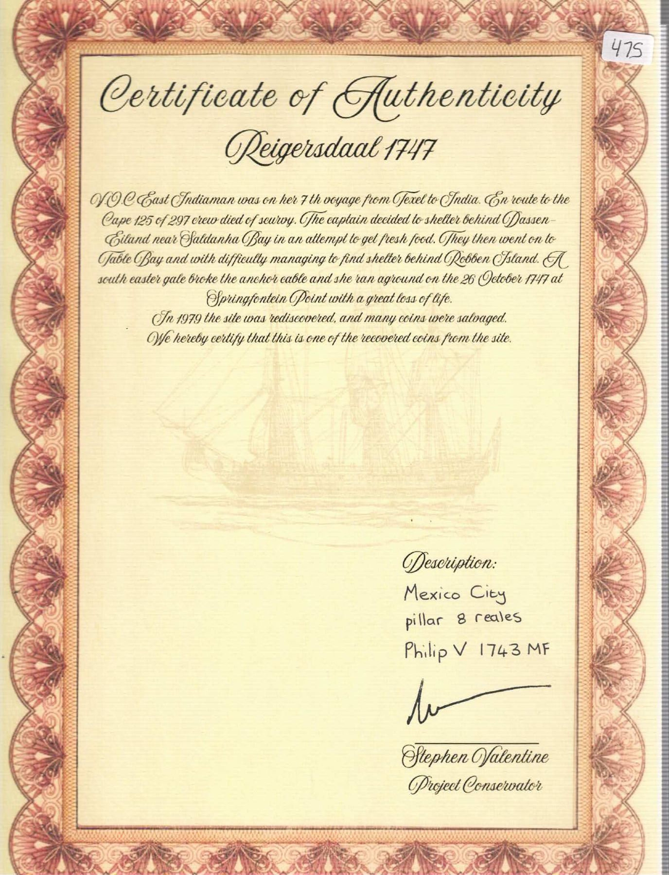 MEXICO, Mexico City, pillar 8 reales, Philip V, 1743 MF. Yonaka-M8.43; KM-103; Cal-1463. 26.46 grams. Bold AU details with practically no corrosion, nicely contrasting toning. Pedigreed to the Steve Valentine Collection, with original certificate from the salvor/conservator. Recovered from: Reijgersdaal, sunk in 1747 off South Africa