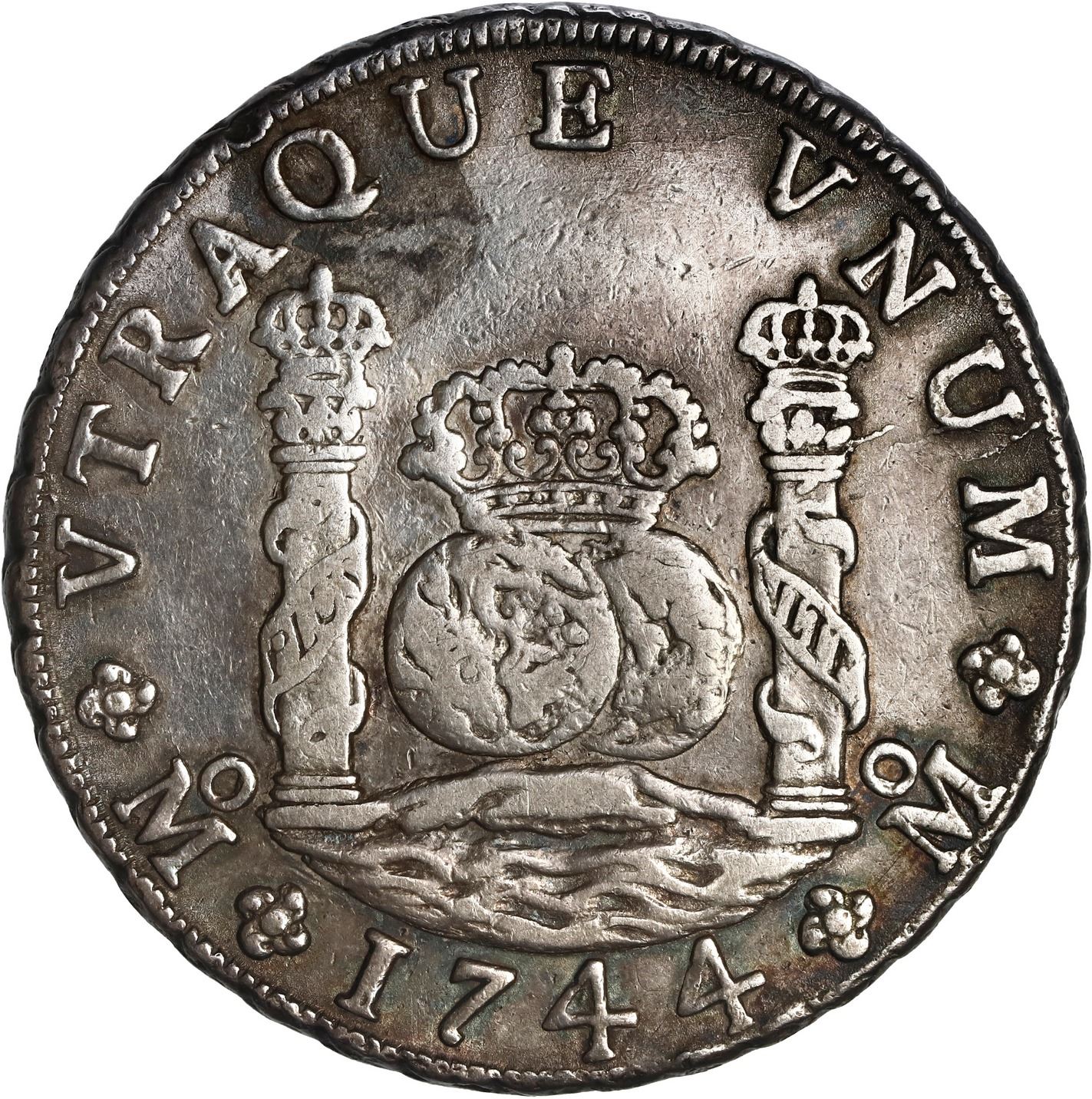 MEXICO, Mexico City, pillar 8 reales, Philip V, 1744 MF, ex-Brameld. Yonaka-M8.44; Cal-1466; KM-103. 26.83 grams. Nice VF+ with spots of deep rainbow toning, no problems. Pedigreed to the David Brameld Collection.