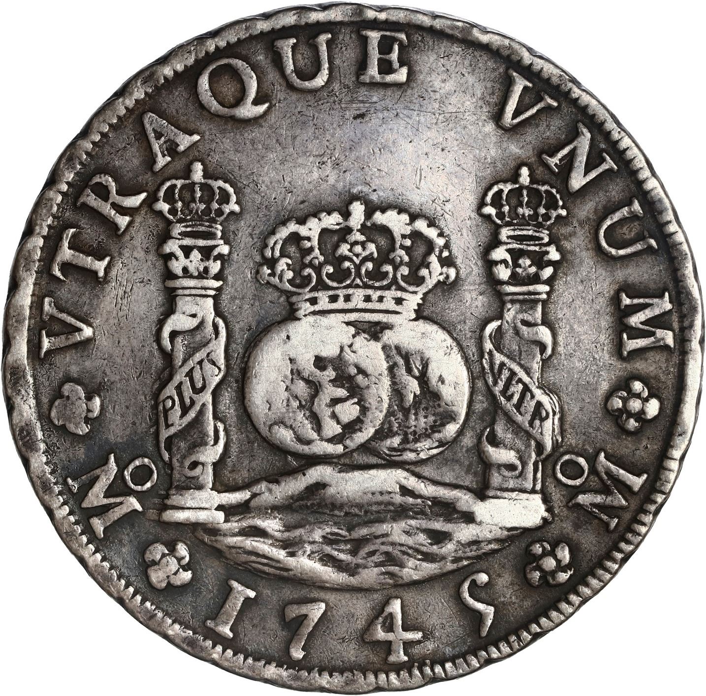 MEXICO, Mexico City, pillar 8 reales, Philip V, 1745 MF, ex-Brameld. Yonaka-M8.45; Cal-1468; KM-103. 26.78 grams. Deeply toned XF with full rims and nice aspect, no problems. Pedigreed to the David Brameld Collection.