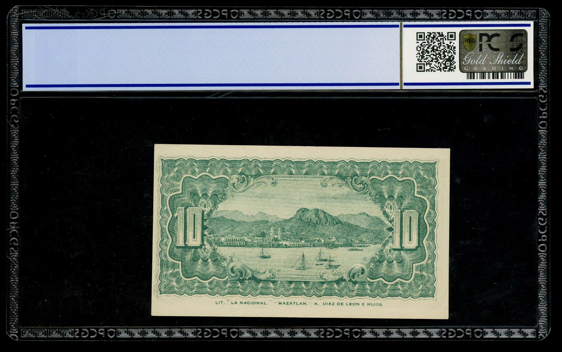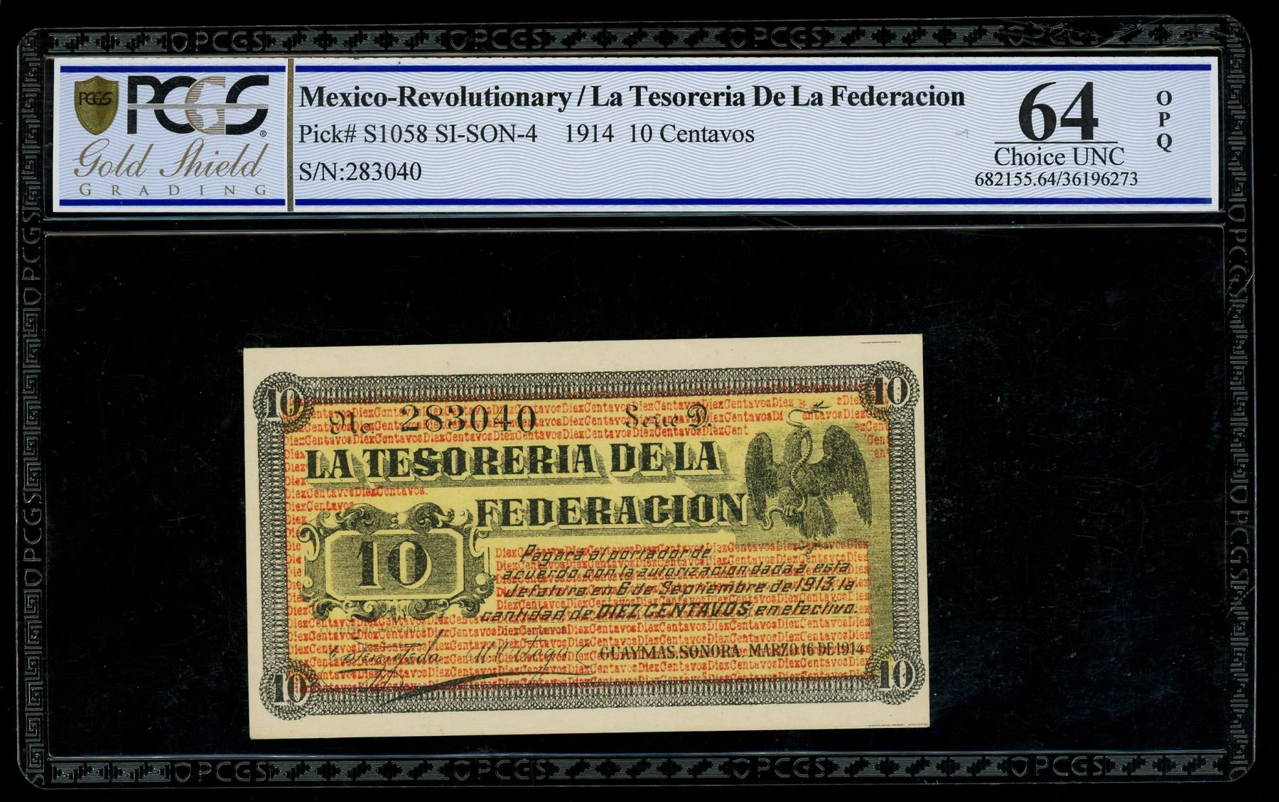 MEXICO, Sonora, Guaymas, Tesorería de la Federación, 10 centavos, 16-3-1914, series D, serial 283040, PCGS Banknote Choice UNC 64 OPQ. Pick-S1058. Colorful note with great ink colors and paper originality.