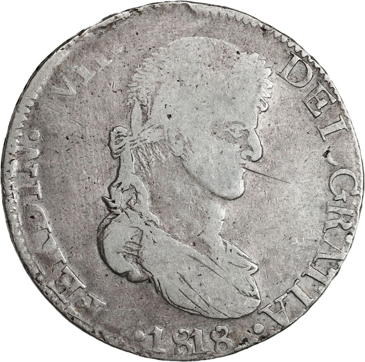 MEXICO, Zacatecas, bust 8 reales, Ferdinand VII, 1818 AG. Ramírez-Z8.8; KM-111.5; Cal-1459. 25.47 grams. VF with some surface chatter and marks, a bit of strike weakness at the top.