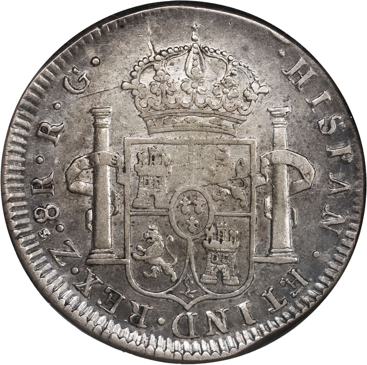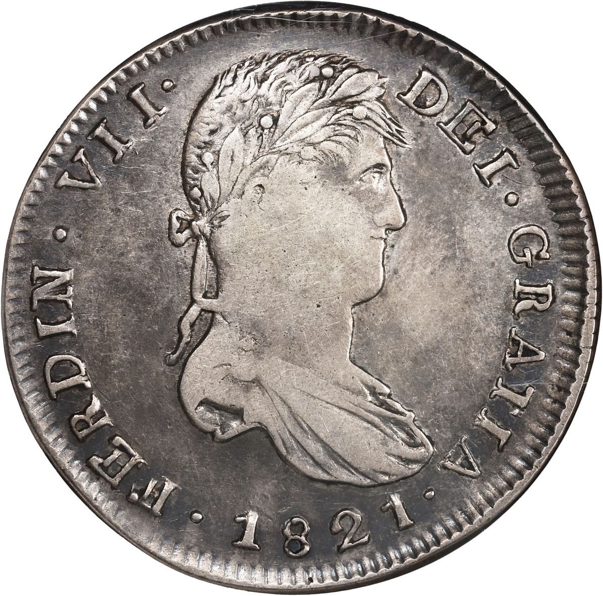 MEXICO, Zacatecas, bust 8 reales, Ferdinand VII, 1821/81 RG, NGC VF 25. Ramírez-Z8.11.1c; Cal-1469; KM-111.5. Nicely toned over smooth surfaces (cleaned long ago), tall but incomplete rims dues to slightly off-center strike, weak centers as usual (arguably XF otherwise).