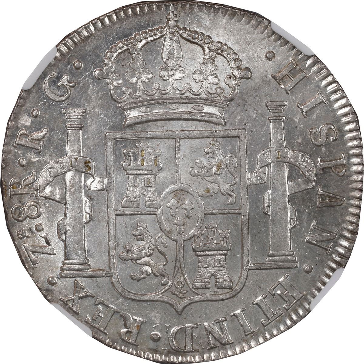 MEXICO, Zacatecas, bust 8 reales, Ferdinand VII, 1821 RG, NGC MS 63. Ramírez-Z8.11.1 var; Cal-1465; KM-111.5. Flashy luster and sharp full details including 100% rims, no toning, faint wisps in obverse fields, choice grade, variety with bust C and crown A but no errors or overdate.