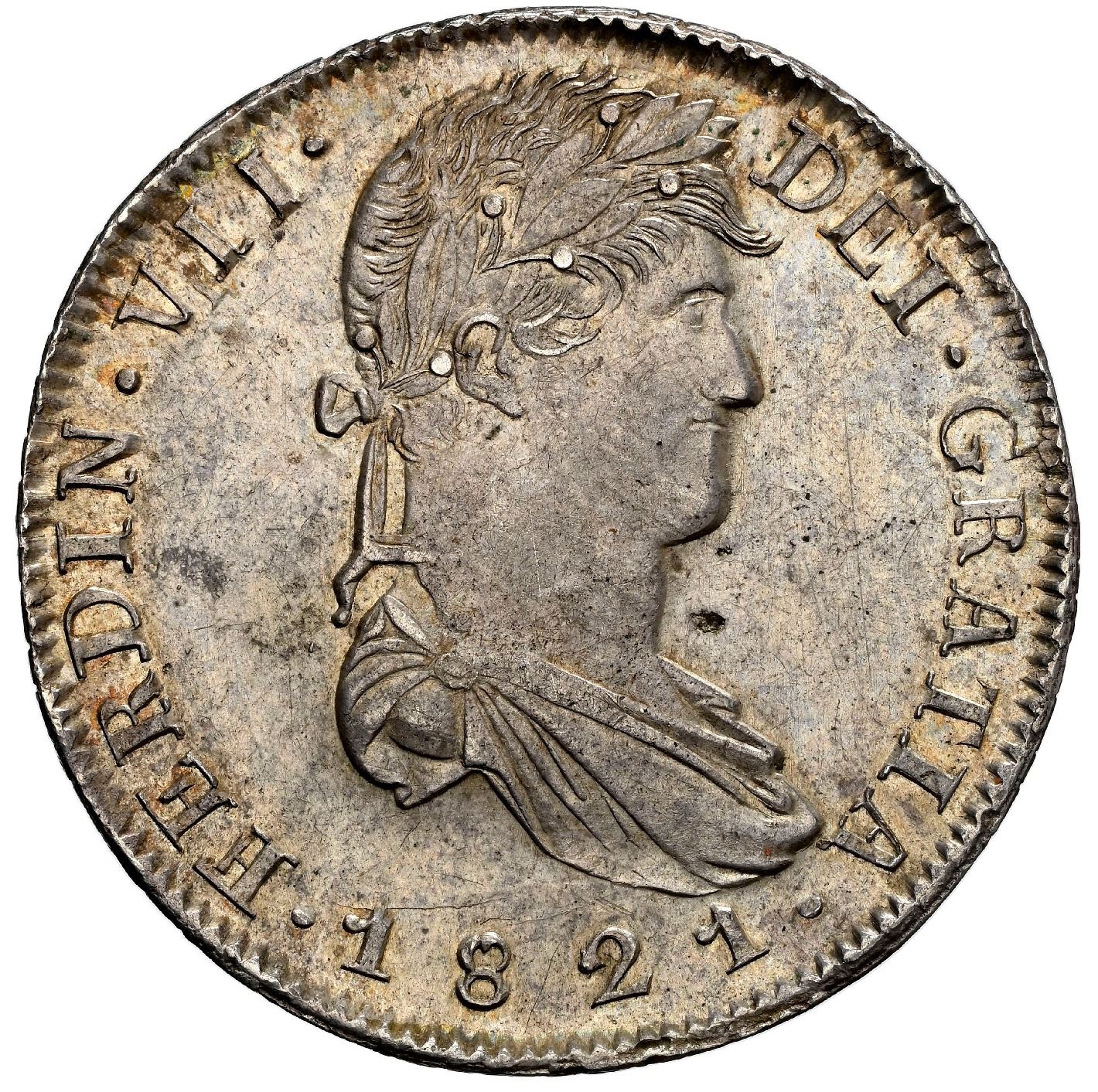MEXICO, Zacatecas, bust 8 reales, Ferdinand VII, 1821 RG, NGC UNC details / obv cleaned. KM-111.5; Cal-1465. Superb luster with faint golden toning (over old hairlines, in the case of the obverse only), bold strike, noted by NGC as "HISPAN" variety to distinguish from the very rare error with "HISAV" instead.