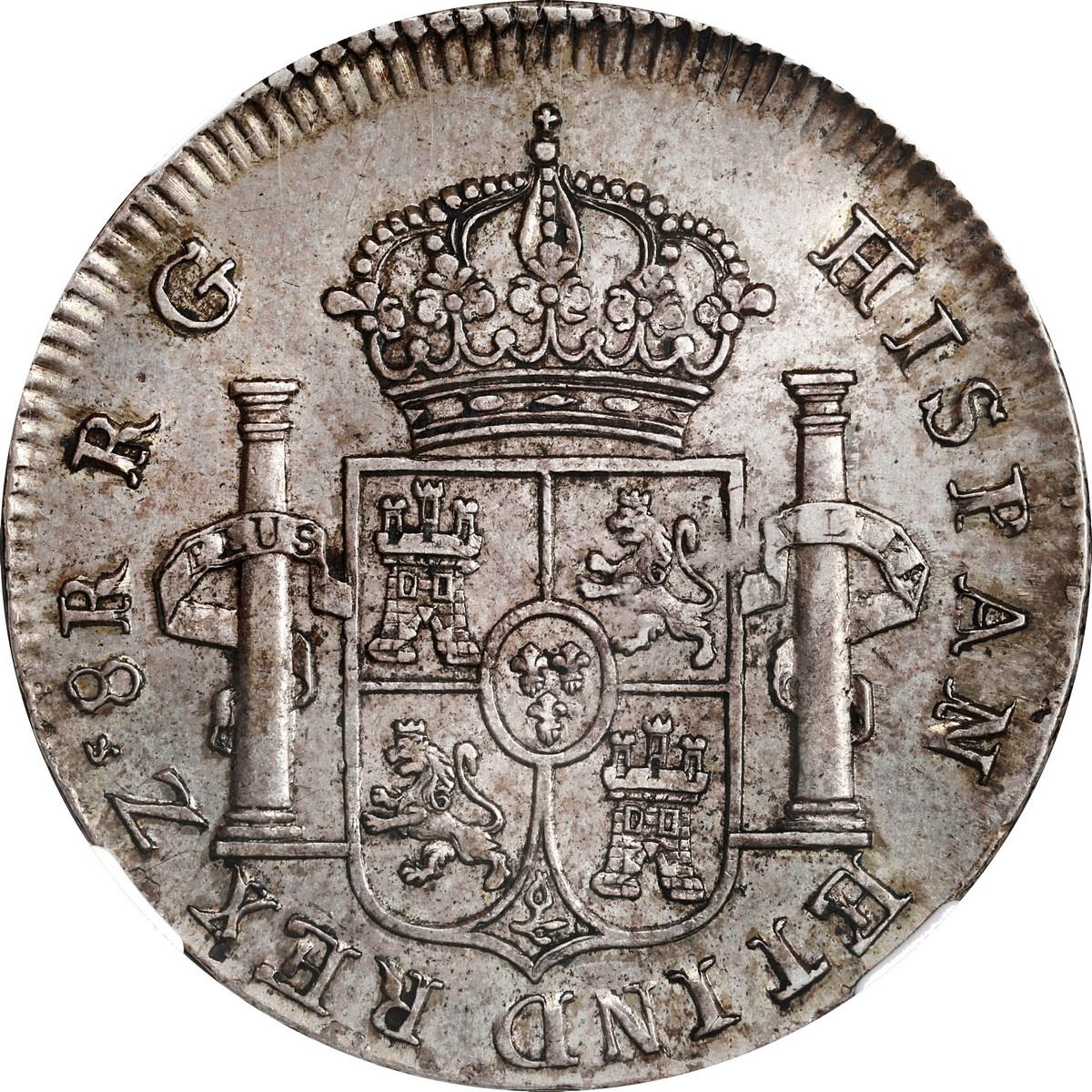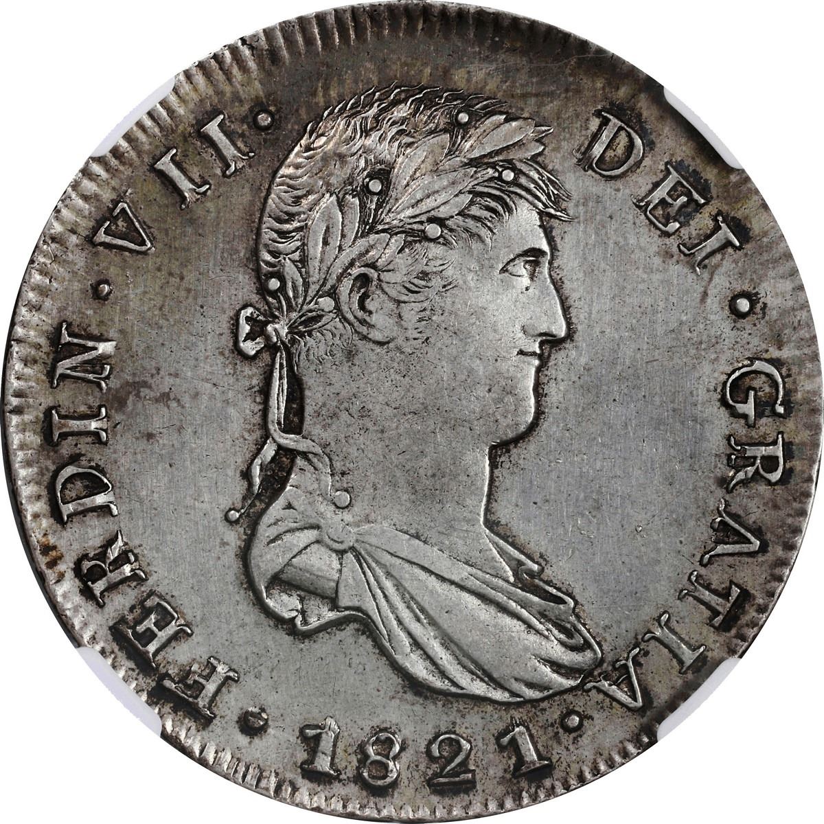 MEXICO, Zacatecas, bust 8 reales, Ferdinand VII, 1821 RG, no stops on reverse, very rare, NGC XF details / surface hairlines, Ramírez Plate. Ramírez-Z8.11.1e (this coin); Cal-unl (cf 1465); KM-unl (111.5 for type). Bold strike with tall rims (nearly full), very light rainbow toning over luster, dramatic error that NGC emphasized by slabbing it with the reverse out. Plate Coin on page 212 of Coins of Mexican War of Independence (2021), by Juan Felipe Ramírez.