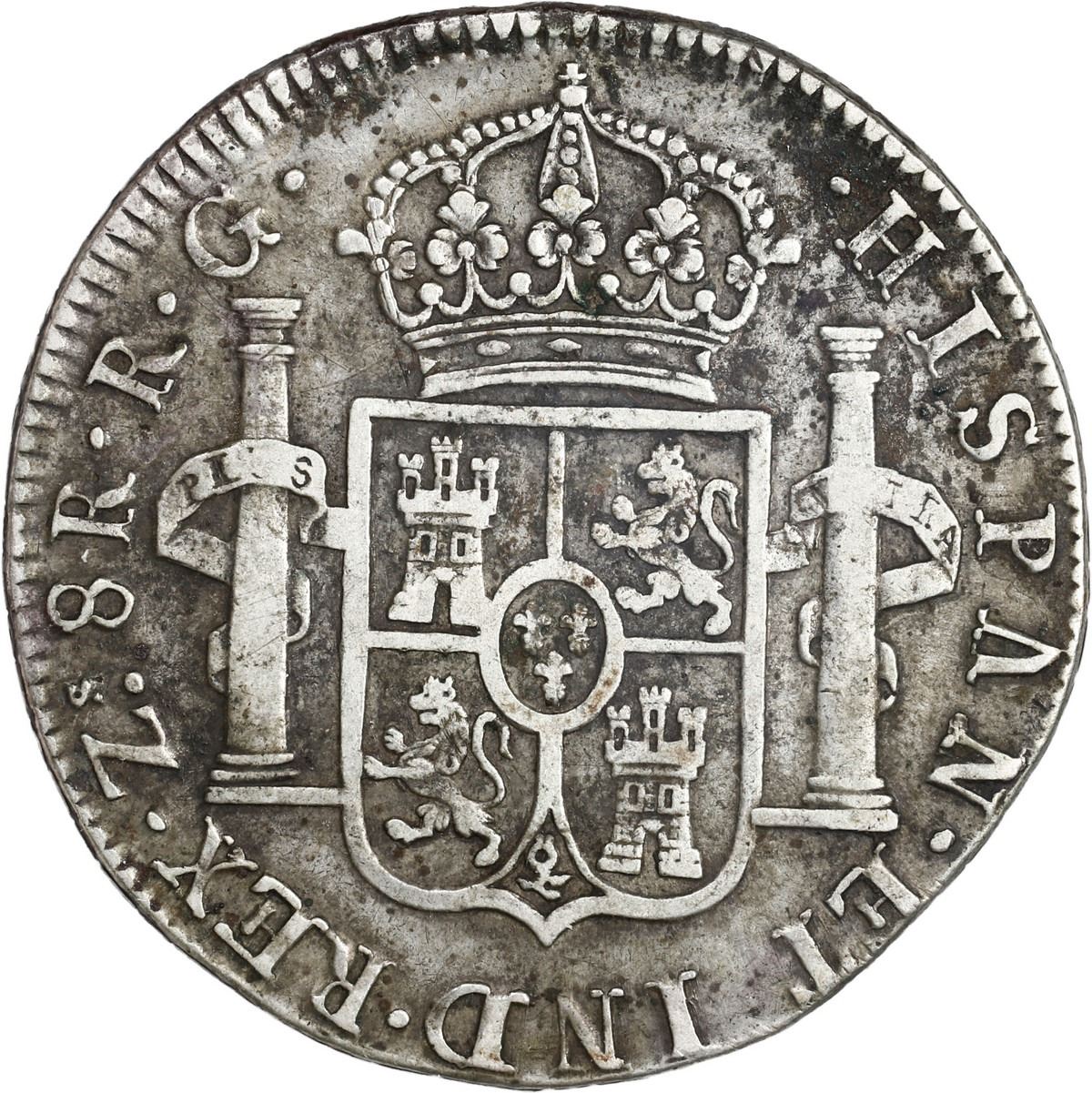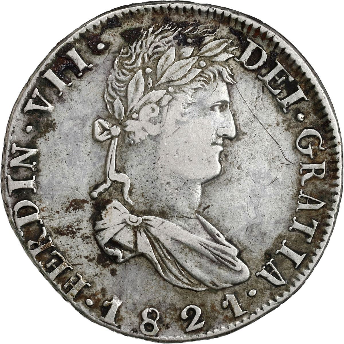 MEXICO, Zacatecas, bust 8 reales, Ferdinand VII, 1821 RG, variety with upside-down V for A in HISPAN. Ramírez-Z8.11; KM-111.5; Cal-1465. 26.44 grams. Boldly struck XF with full bust detail, some sedimentation and scratches in the fields.