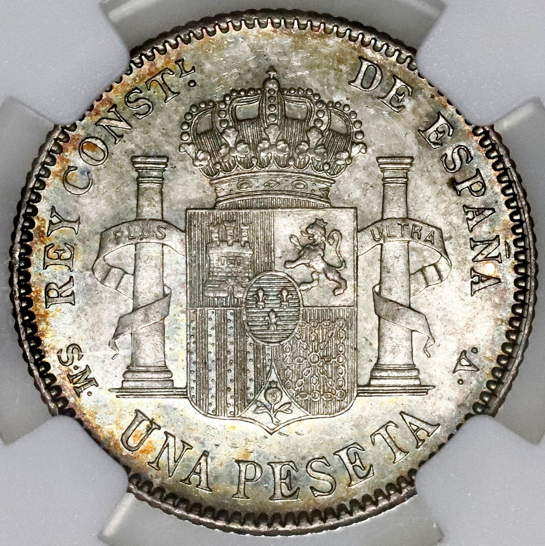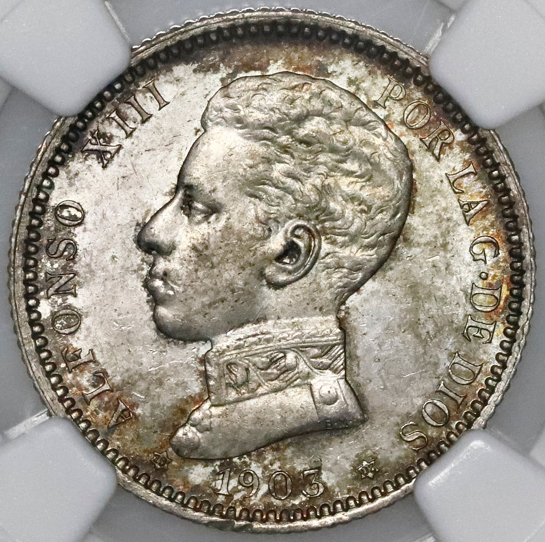 Madrid, Spain, 1 peseta, Alfonso XIII, 1903SMV with 19-03 inside stars, NGC MS 63. Cal-67; KM-721. Lustrous with speckled rainbow toning on the obverse and fully toned reverse. NGC #4702956-010
