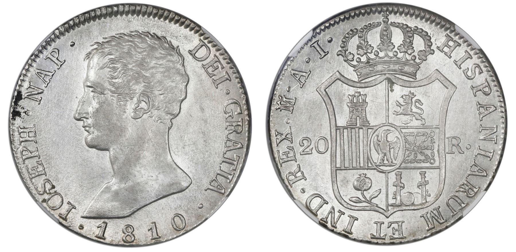 Madrid, Spain, 20 reales de vellon, Joseph Napoleon, 1810AI, large eagle, NGC AU 58. CT-25; KM-551.2 . Brightly lustrous and non-toned, with very light high-point wear and faint hairlines in obverse fields, still choice grade. NGC #3833388-005.