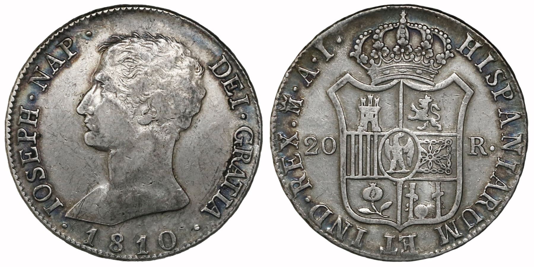 Madrid, Spain, 20 reales de vellon, Joseph Napoleon, 1810AI.